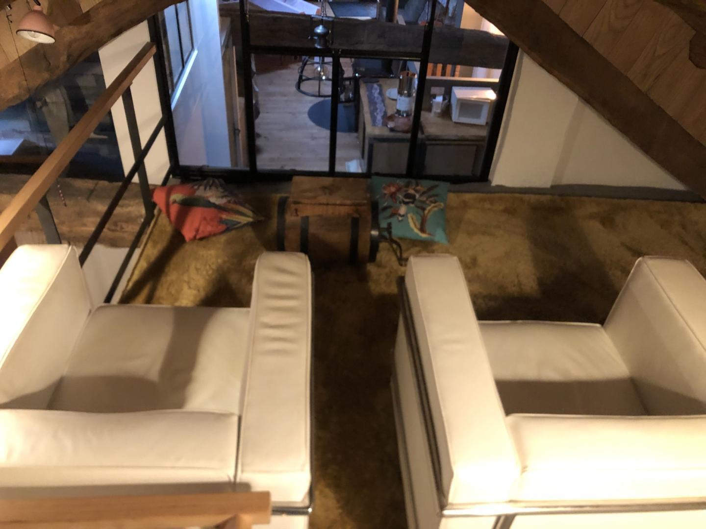 À l’étage, une mezzanine mansardée surplombe l’espace principal. Aménagée en coin détente, elle devient un refuge pour lire, rêver ou observer les volumes de la pièce depuis les hauteurs.