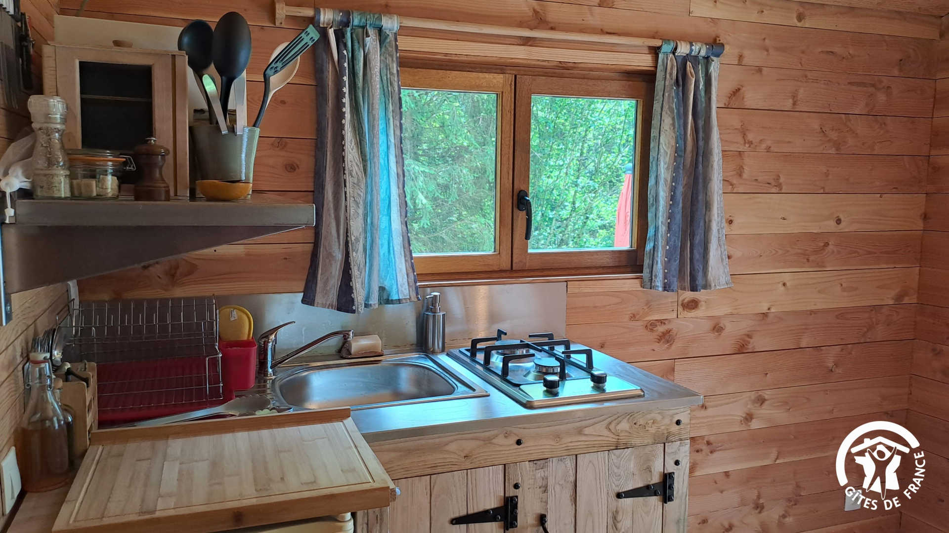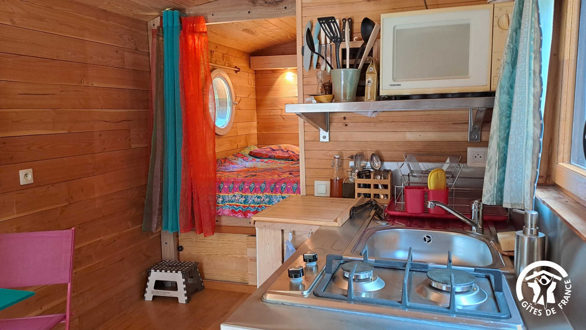 Dans un esprit cocooning, vous trouverez un espace cuisine avec une plaque de cuisson 2 feux, un frigo top, un four micro-onde combiné, une bouilloire et une cafetière à piston.