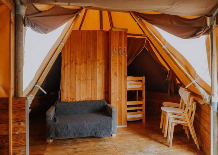 Made from canvas and wood, it has three separate bedrooms for added privacy. There are two double beds (140 cm) for couples, plus two bunk beds and a single sofa bed, sleeping up to 4 adults and 3 children.