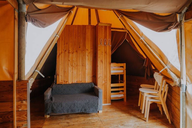 Built from wood and canvas, the lodge has three separate bedrooms, guaranteeing privacy and tranquillity. It can accommodate up to 4 adults and 3 children, with two double beds, two bunk beds and a sofa bed.