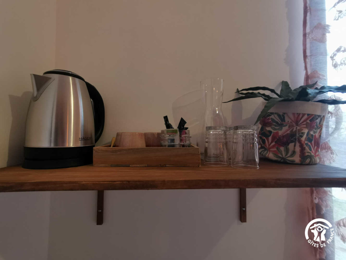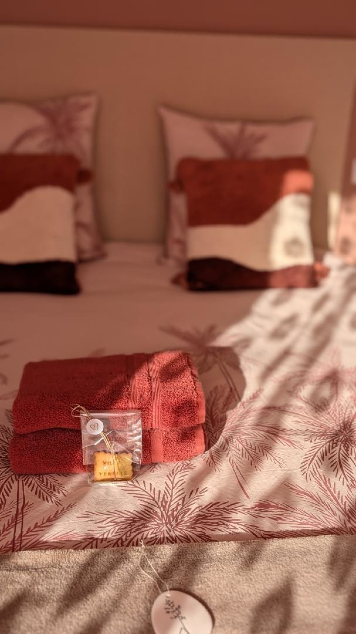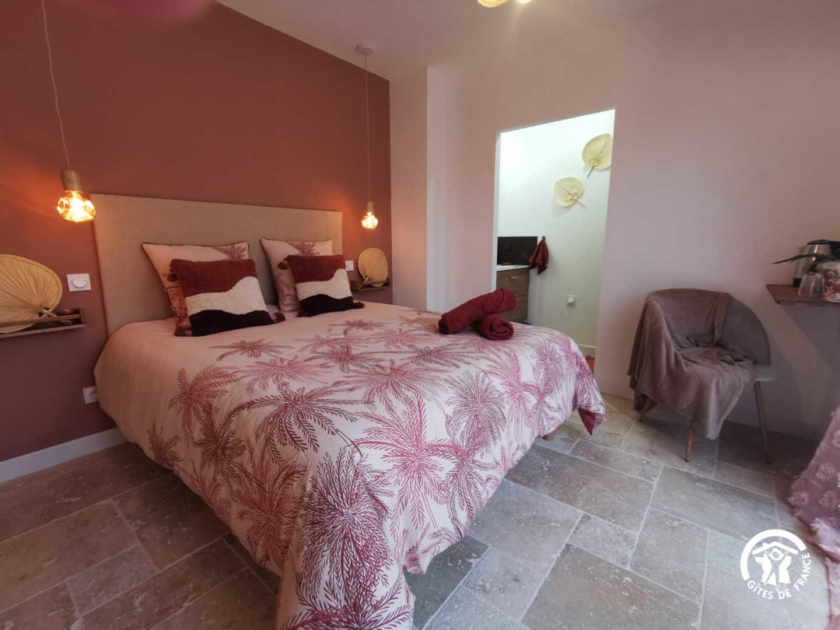 Entre el mar y los viñedos, aproveche la calma de la naturaleza para recargar las pilas y admirar los encantos de los pequeños compañeros de la granja o escuchar el fluir del agua del estanque. Cuando hace buen tiempo, disfrute de la piscina con sus tumbonas, su cocina de verano cubierta (con nevera) y su bar. La piscina está abierta de 9h30 a 19h30 del 15 de mayo al 15 de septiembre. Los propietarios pueden proporcionarle toallas si lo desea. Cada habitación tiene acceso a su propia terraza privada. El desayuno se sirve dentro o fuera de la casa, si el tiempo lo permite, entre las 8.00 y las 9.30 horas. Hay aparcamiento privado a disposición de los viajeros. Servicios adicionales: Alquiler de bicicletas en el sitio está disponible todo el año, así como alquiler de embarcaciones (medio día o día completo) con licencia (mayo a septiembre). Table d’hôtes nocturna (con reserva previa los miércoles y viernes de julio y agosto únicamente) Iniciación a la cata de vinos (3 horas) Servicio de aparcacoches a petición (estación de Béziers, aeropuerto de Béziers-Vias) Accesibilidad: Autopista A9, salida 36 Béziers OUEST, seguir dirección Valras plage. En Vendres 34350, poner en Google Maps “impasse aurore”, una vez en el cruce, tomar el camino de tierra impasse de fontvieille a la izquierda y llegar hasta el fondo. Usted ha llegado a nuestra casa de huéspedes “Villa Vénéris”. – 1 cama de matrimonio, 1 cama de 90cm, 20 m², 3 pers. Esta habitación, de colores cálidos como el terracota y el cobre, puede alojar hasta 3 personas con su cama de matrimonio (160cm), una cama supletoria (90cm), un cuarto de baño con ducha italiana, lavabo individual y WC separado.
