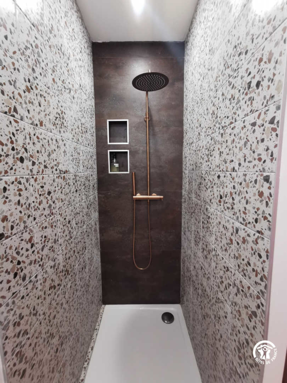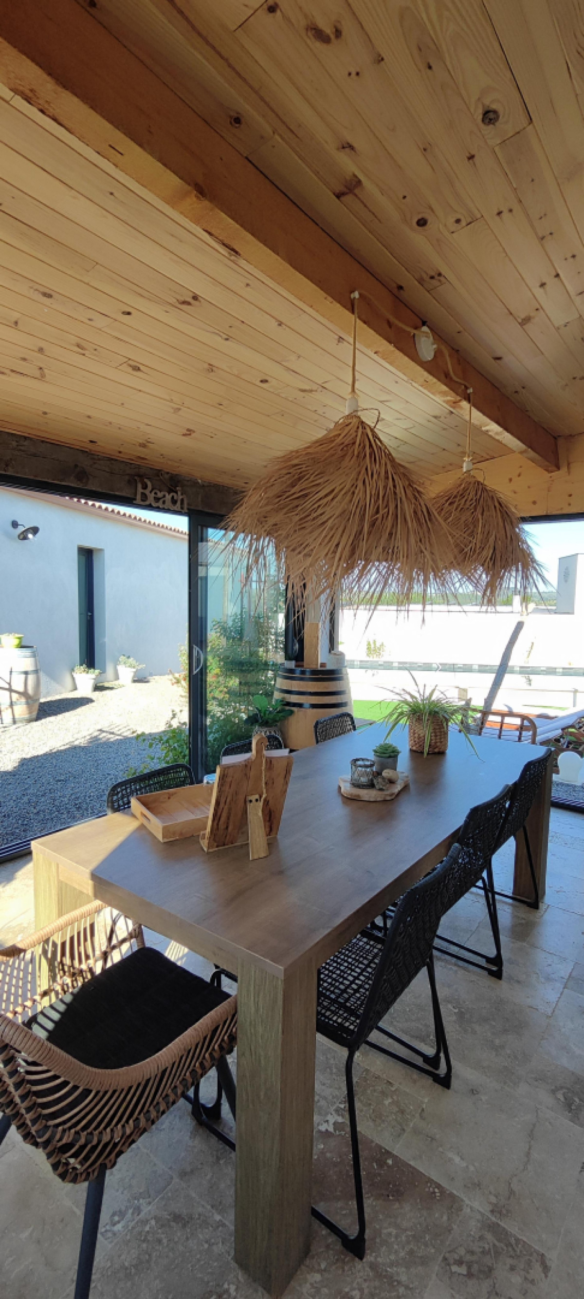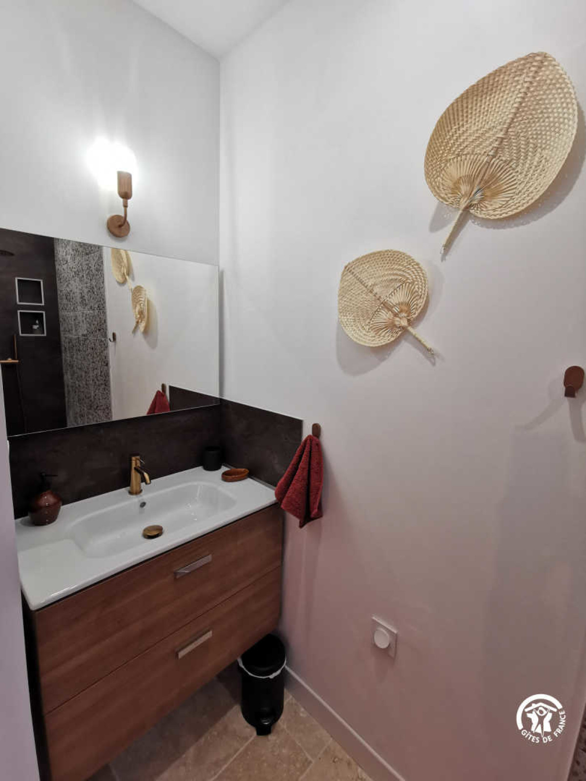 Entre el mar y los viñedos, aproveche la calma de la naturaleza para recargar las pilas y admirar los encantos de los pequeños compañeros de la granja o escuchar el fluir del agua del estanque. Cuando hace buen tiempo, disfrute de la piscina con sus tumbonas, su cocina de verano cubierta (con nevera) y su bar. La piscina está abierta de 9h30 a 19h30 del 15 de mayo al 15 de septiembre. Los propietarios pueden proporcionarle toallas si lo desea. Cada habitación tiene acceso a su propia terraza privada. El desayuno se sirve dentro o fuera de la casa, si el tiempo lo permite, entre las 8.00 y las 9.30 horas. Hay aparcamiento privado a disposición de los viajeros. Servicios adicionales: Alquiler de bicicletas en el sitio está disponible todo el año, así como alquiler de embarcaciones (medio día o día completo) con licencia (mayo a septiembre). Table d’hôtes nocturna (con reserva previa los miércoles y viernes de julio y agosto únicamente) Iniciación a la cata de vinos (3 horas) Servicio de aparcacoches a petición (estación de Béziers, aeropuerto de Béziers-Vias) Accesibilidad: Autopista A9, salida 36 Béziers OUEST, seguir dirección Valras plage. En Vendres 34350, poner en Google Maps “impasse aurore”, una vez en el cruce, tomar el camino de tierra impasse de fontvieille a la izquierda y llegar hasta el fondo. Usted ha llegado a nuestra casa de huéspedes “Villa Vénéris”. – 1 cama de matrimonio, 1 cama de 90cm, 20 m², 3 pers. Esta habitación, de colores cálidos como el terracota y el cobre, puede alojar hasta 3 personas con su cama de matrimonio (160cm), una cama supletoria (90cm), un cuarto de baño con ducha italiana, lavabo individual y WC separado.