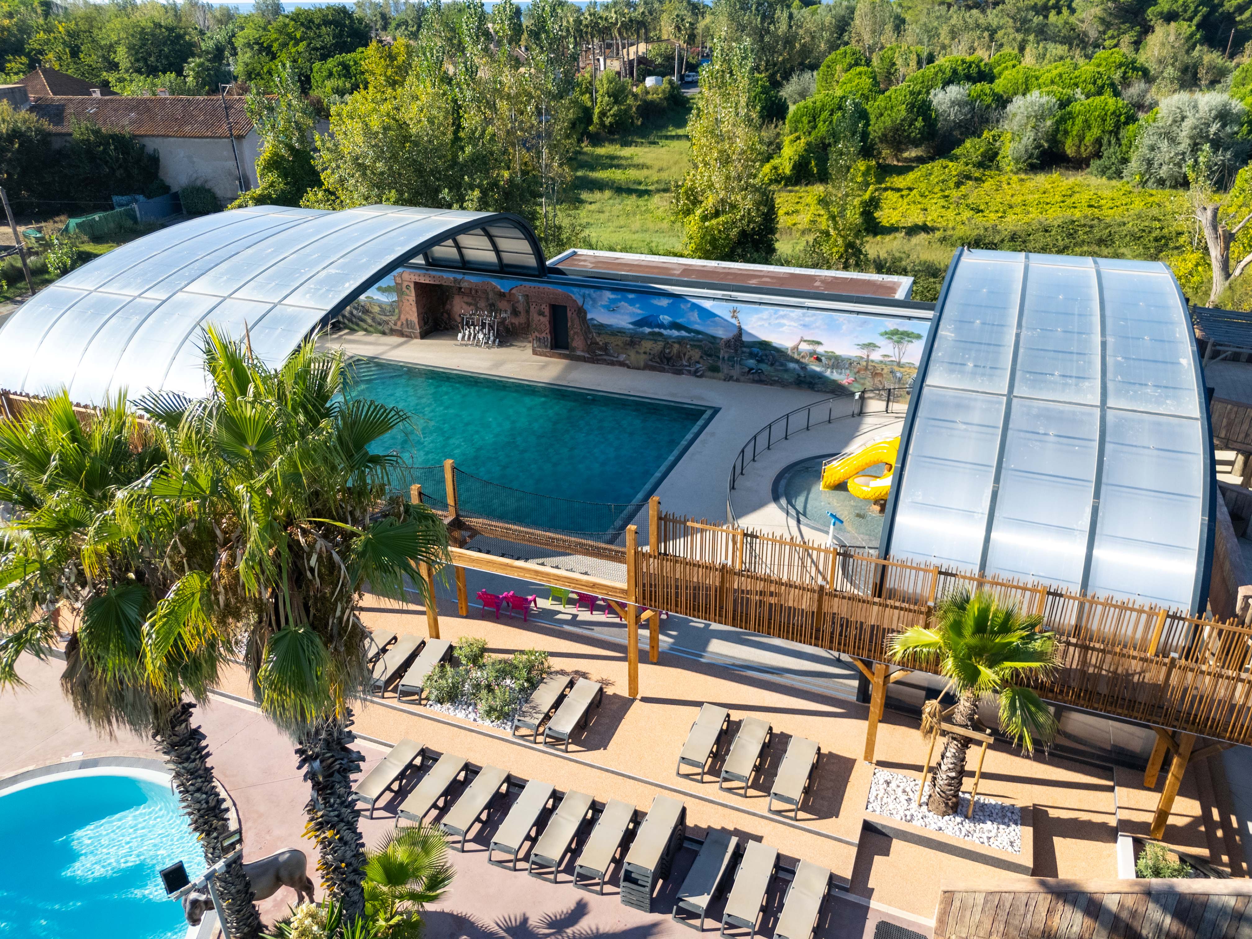This campsite offers a superb savannah-themed water park (5 slides, lagoon pools, an integrated jacuzzi, a secure paddling pool), a new covered and heated pool area with water games for children, and a heated spa area unique to Vias (various pools with massage jets, jacuzzis, sauna, steam room, massage parlour, etc.).