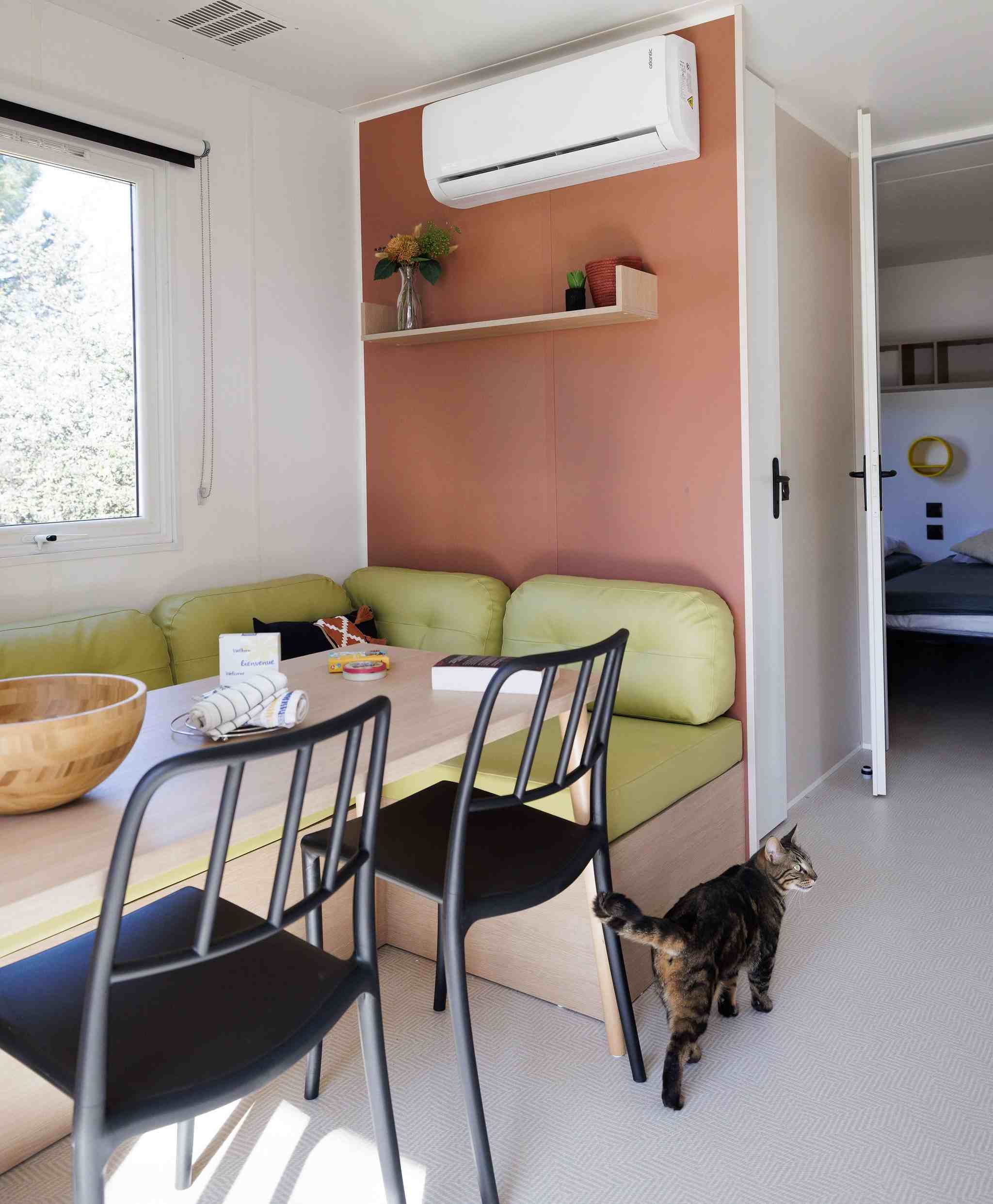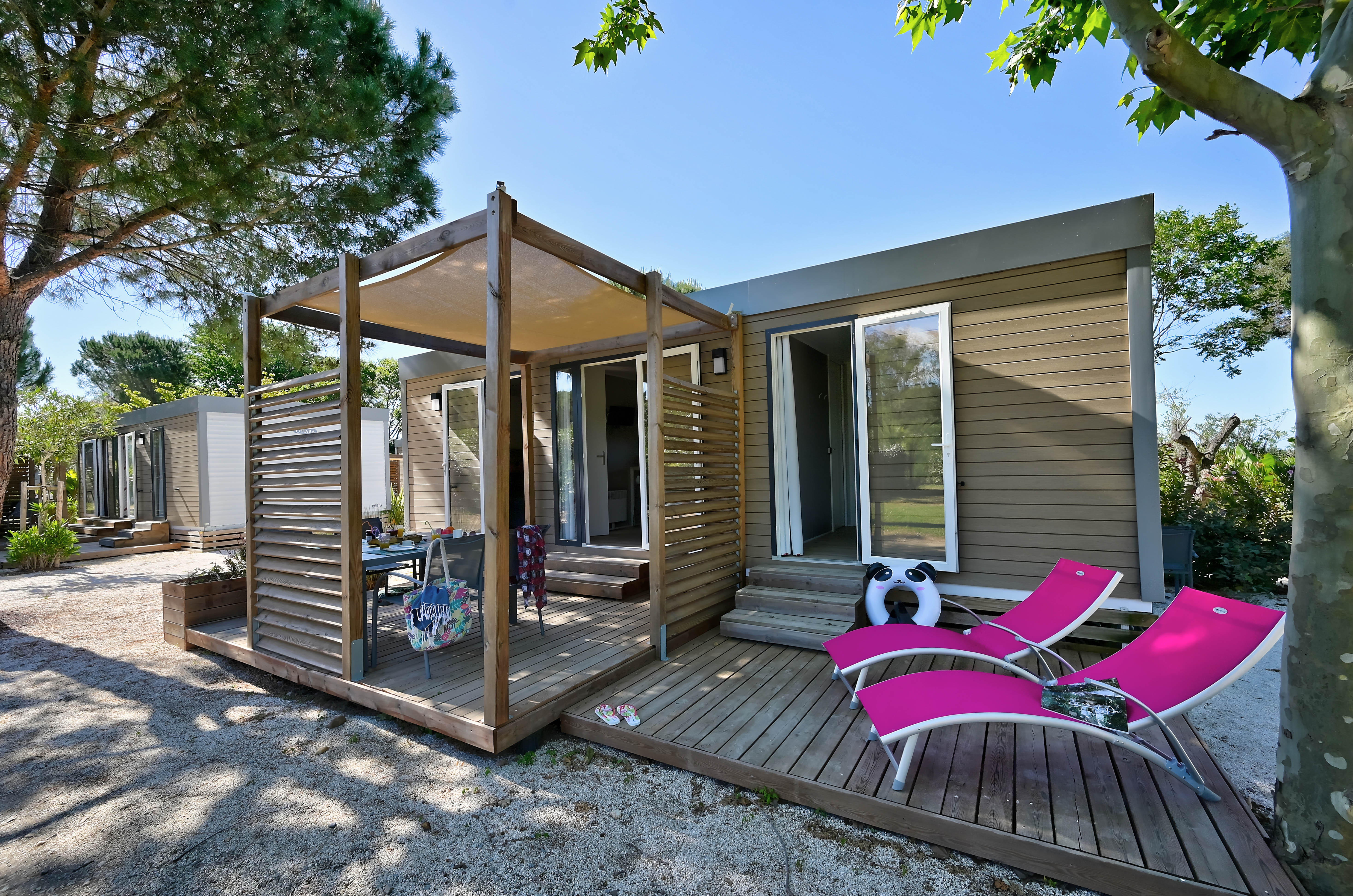 Mobile homes : de 29 à 33 m2, pour 4 à 6 personnes, 8 modèles différents, confortables, modernes et design, dont 8 équipés de terrasse couverte ou semi couverte. Chaque mobile home dispose d’une douche et wc séparés, télévision, le modèle Olivier dispose d’une chambre parentale qui offre un grand lit ainsi qu’un espace pour le lit bébé.