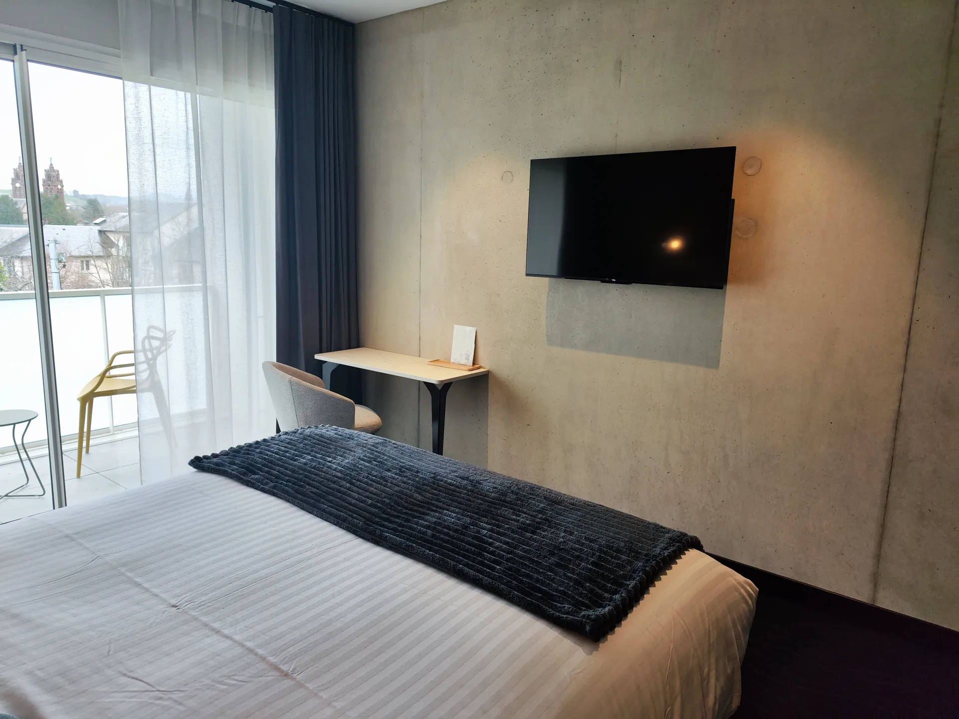 4 chambres supérieures de 22 m² avec literie haut de gamme en 160×220, douche à l’italienne, balcon avec fauteuils et table basse