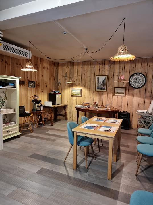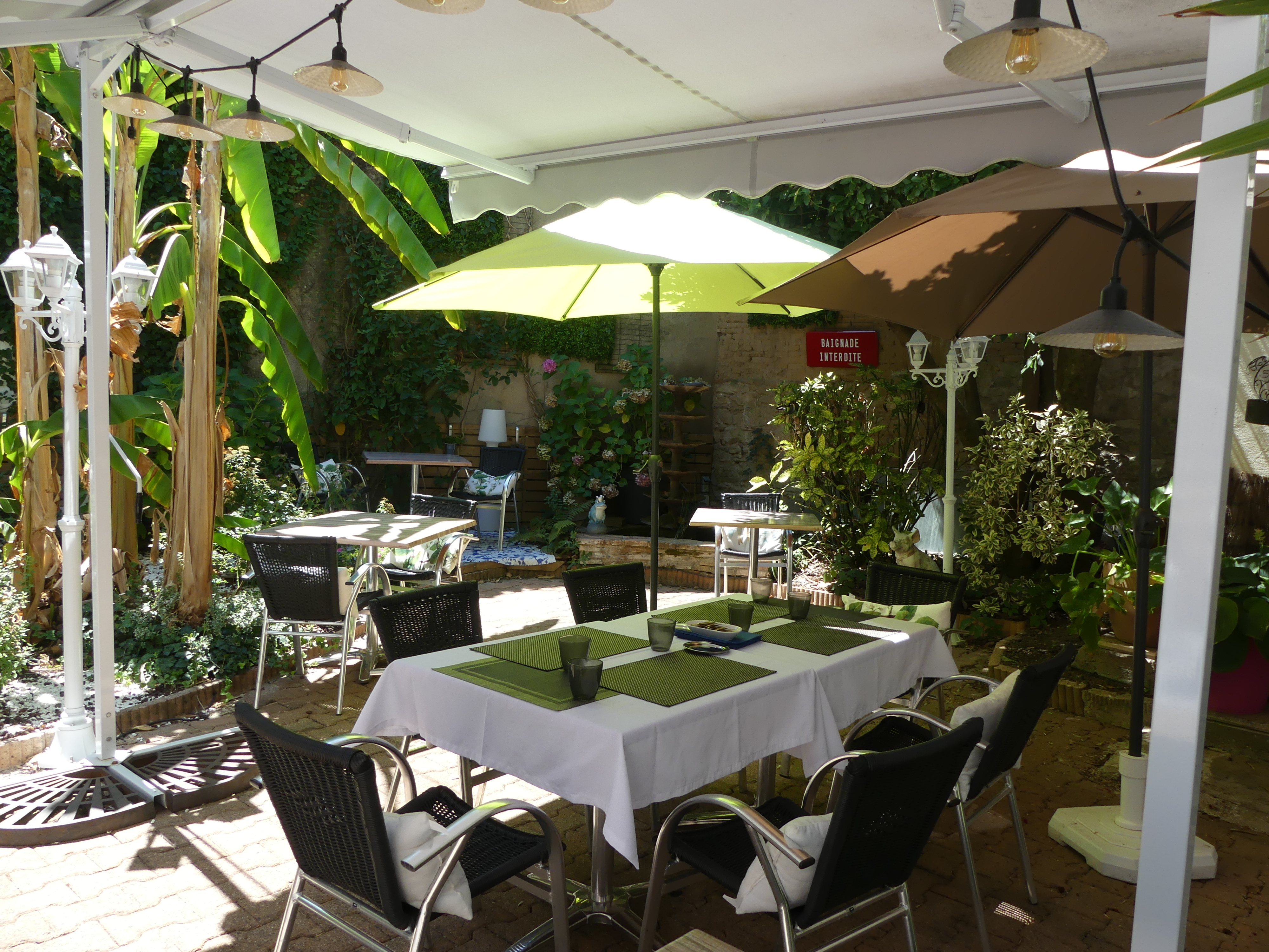 Nuestros huéspedes pueden disfrutar de una cocina familiar y moderna, ligera y variada, de la sombra y la calma de nuestro patio florido, o de nuestros espacios de convivencia.