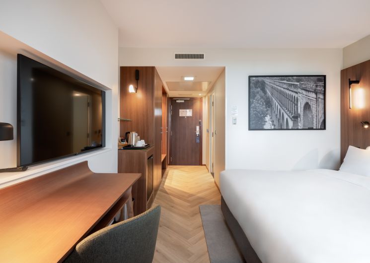 A dos pasos de la Place de la Comédie y del Musée Fabre, el Radisson Blu Hôtel Montpellier goza de una ubicación ideal en pleno centro de Montpellier y frente al Palais des Congrès. Cerca de todos los medios de transporte, la estación de tren TGV de Montpellier Saint Roch se encuentra a 400 metros del hotel y el aeropuerto Montpellier Méditerranée está a 8 km. El Radisson Blu Hôtel Montpellier ofrece 144 habitaciones y suites en un ambiente refinado y contemporáneo. Ideales para reuniones y conferencias de hasta 150 personas, los salones están equipados con las últimas tecnologías y disponen de luz natural en una superficie de 500 m². Nuestro equipo está a su disposición para asesorarle y hacer que sus eventos sean un verdadero éxito. El hotel dispone de un aparcamiento privado de pago y ofrece acceso gratuito a la sala de fitness para sus huéspedes. Nuestro restaurante Le Boudoir Montpelliérain, abierto tanto a los huéspedes del hotel como a los visitantes, sirve cocina tradicional francesa en un ambiente acogedor.