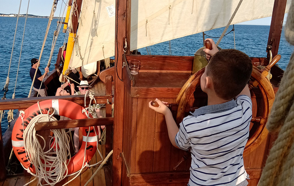 Balades en mer à bord de L’Ange Gardien, trois-mâts à voiles latines. Découverte de la navigation traditionnelle et participation aux manœuvres.