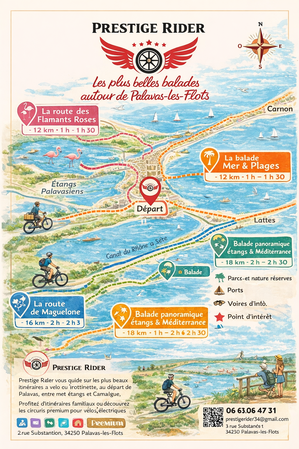 Prestige Rider propose des solutions de mobilité pour découvrir autrement les paysages du littoral méditerranéen et profiter pleinement des balades entre mer, lagunes et espaces naturels de Palavas-les-Flots.