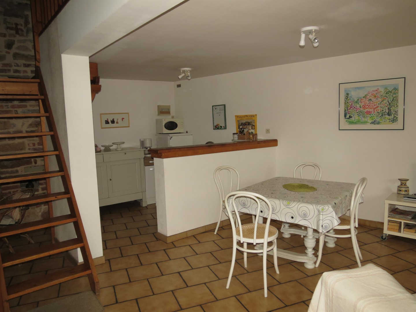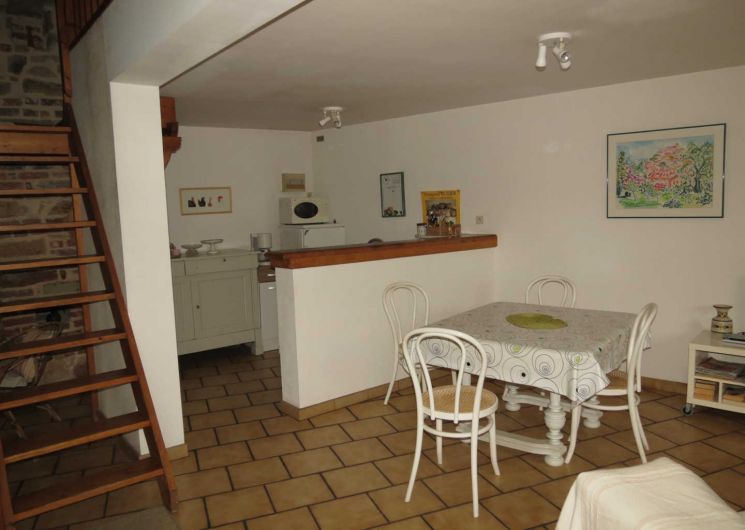 Au rez-de-chaussée : grand séjour lumineux et coin-cuisine.