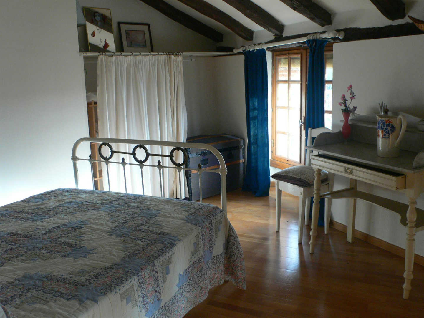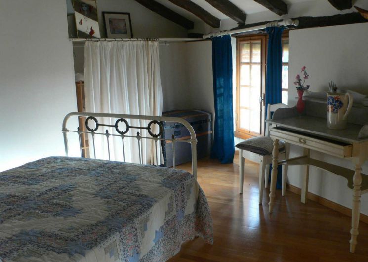 A l’étage sur mezzanine (escalier meunier) : deux espaces couchage, séparés par une salle d’eau (un lit double 140X190cm et un lit simple 120X180cm).