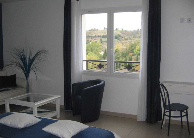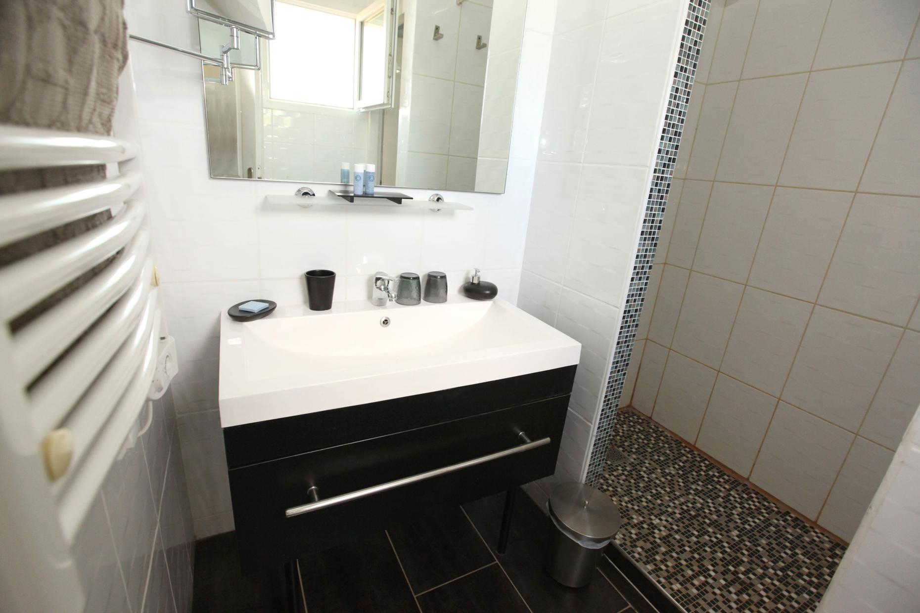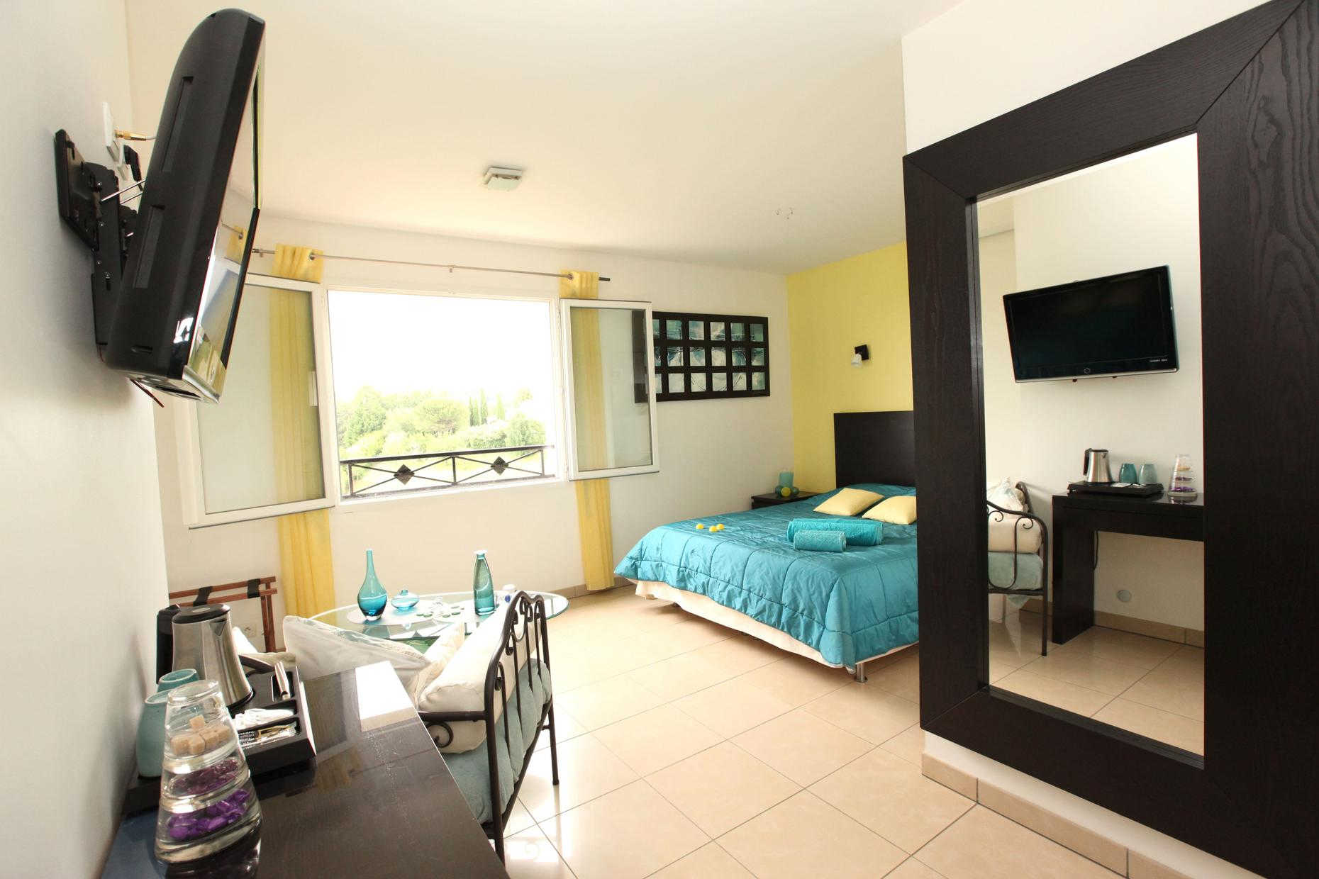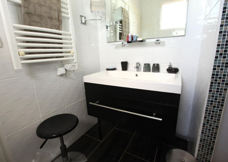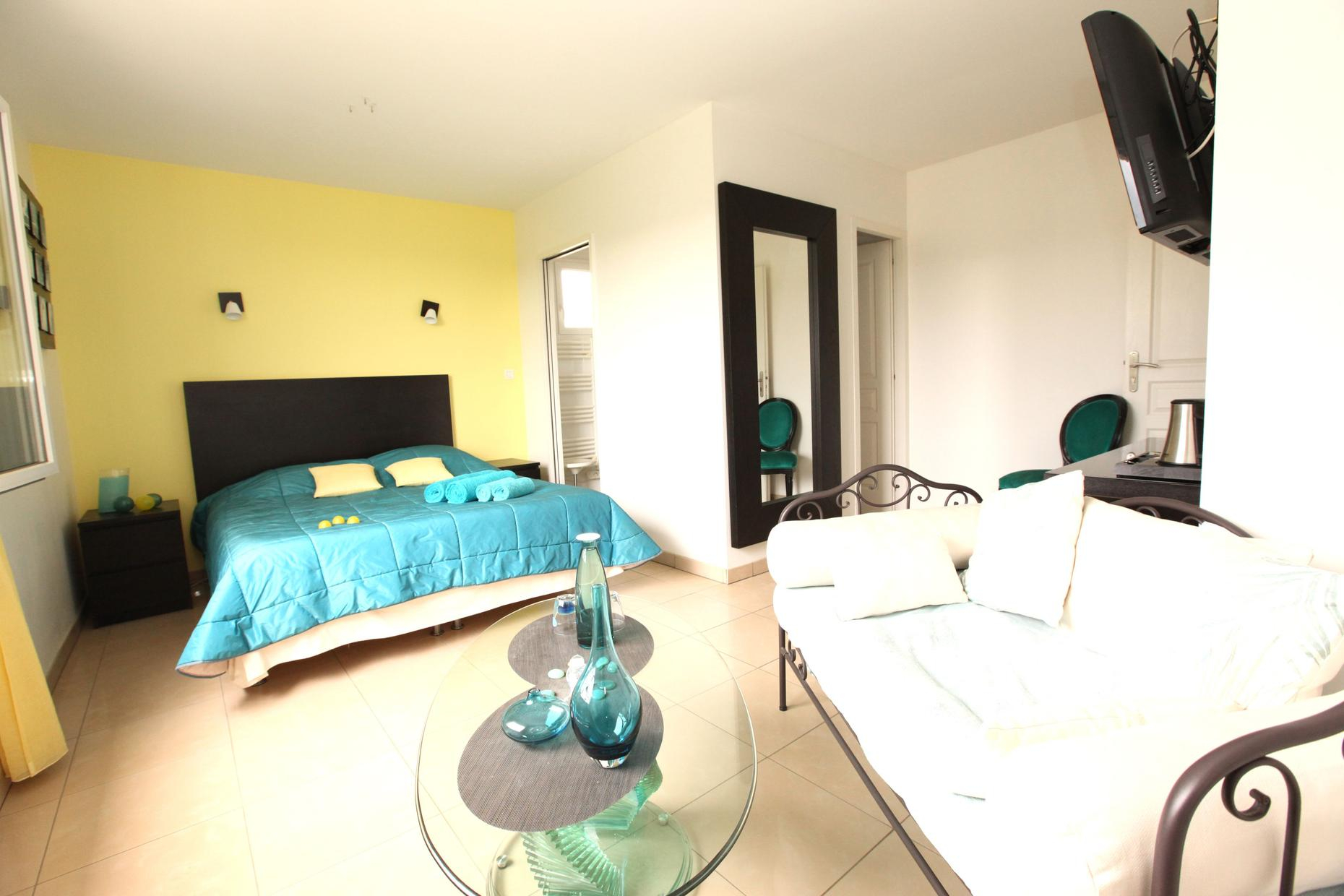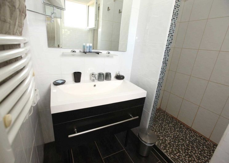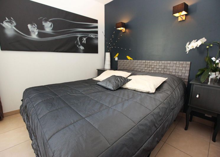– on the ground floor overlooking the terrace: Zen room, classified 3 épis, with a 160×200 bed and private bathroom