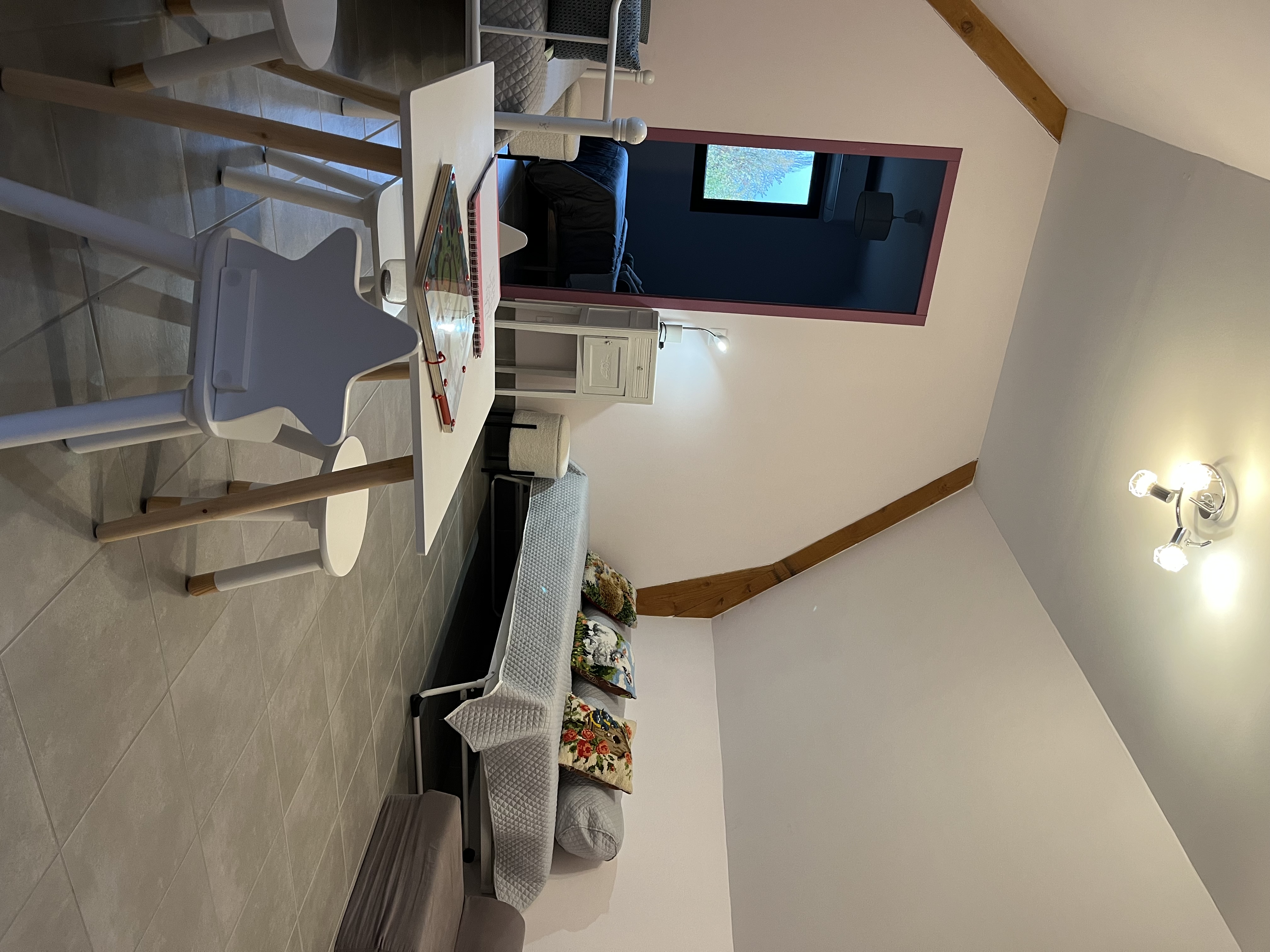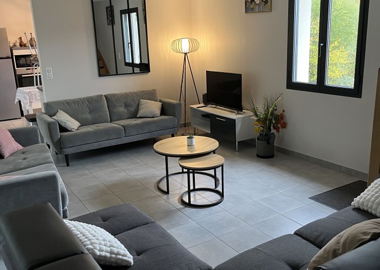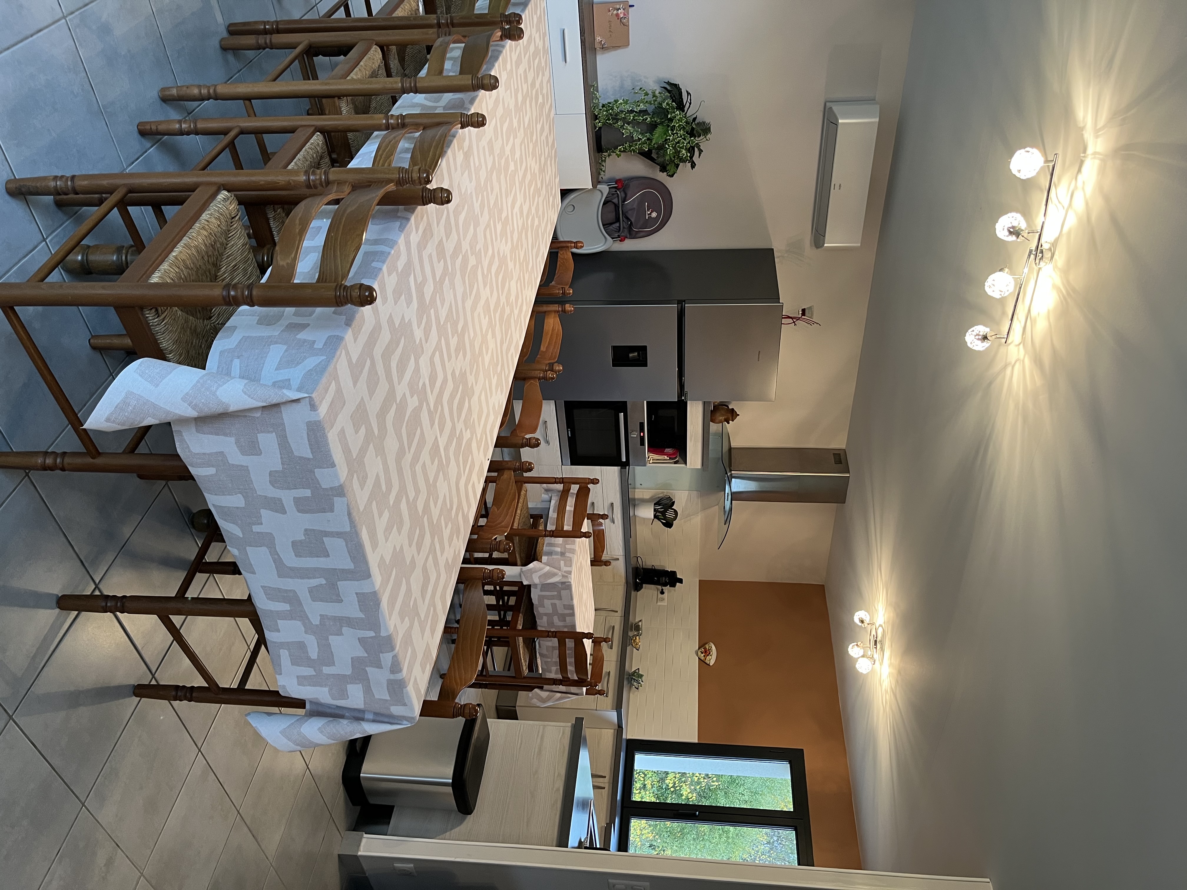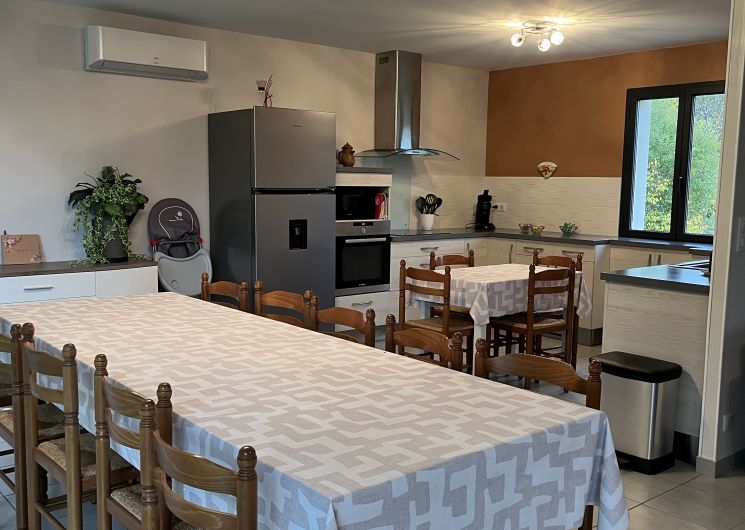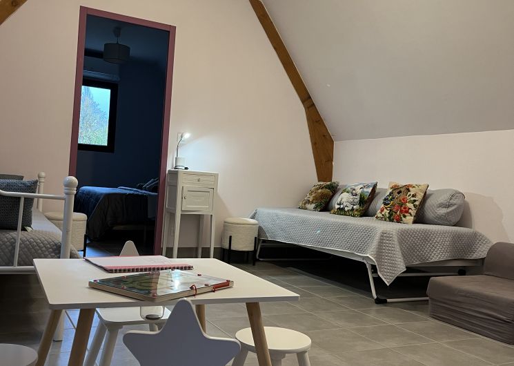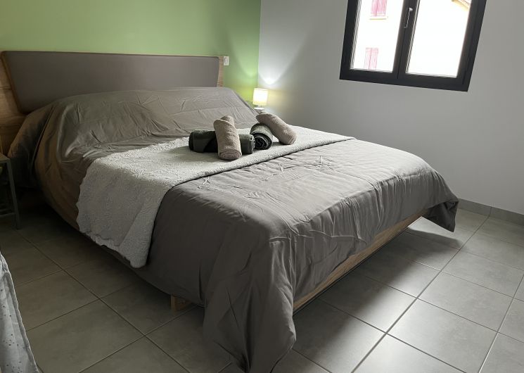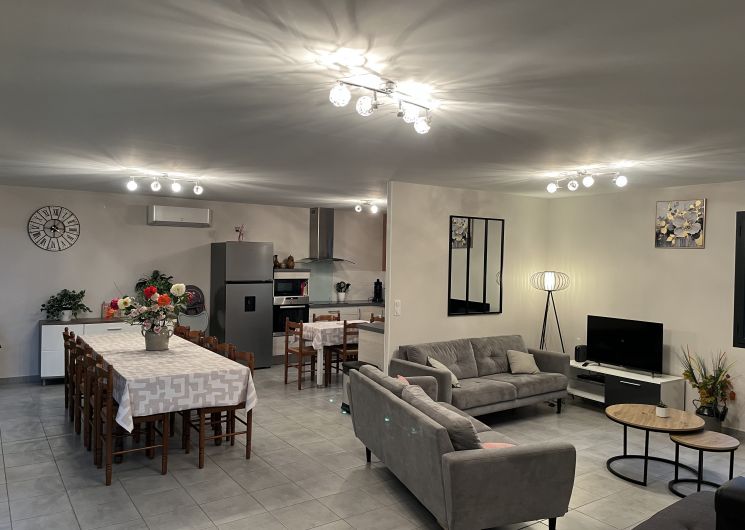Entree de plein-pied avec une cuisine ouverte sur l’espace repas et le salon , deux chambres sont à ce niveau avec 1 lit 160 et 2 lits 80 pouvant être reliè pour faire 1 lit 160 , un wc et une salle d’eau . Un étage il ya deux chambres, une avec 3 lit 90 et une avec 1 lit 160,un espace tv, jeux enfants et deux banquettes lit en 90 y sont installeés. Une salle de bain et un wc . Au sous sol ,une chambre avec 1 lit 90 et 1 lit 140 , une salle d’eau et un wc, une buanderie avec lave linge et sèche linge .