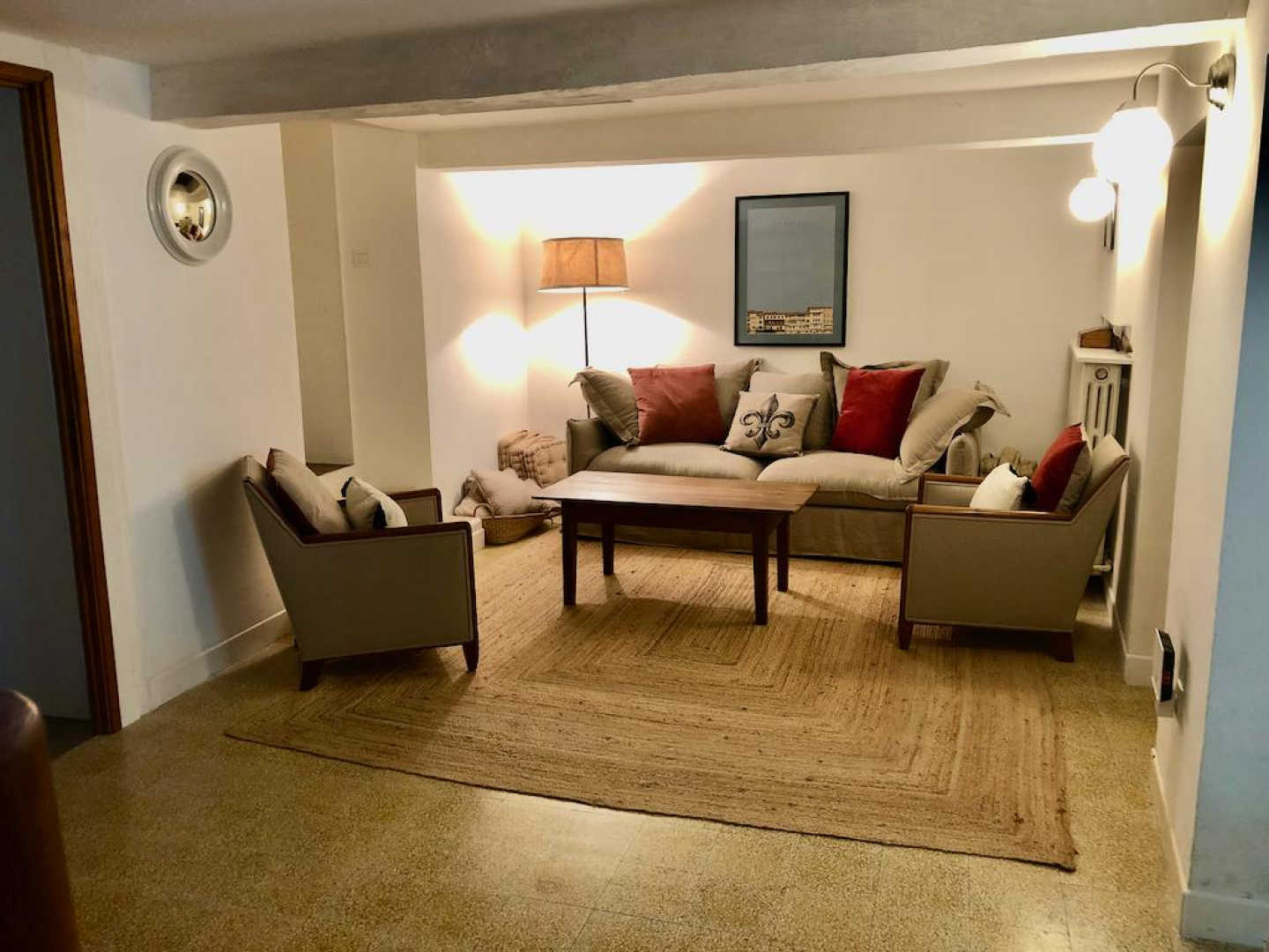 Par quelques marches on accède au salon avec canapé, fauteuils, tv.