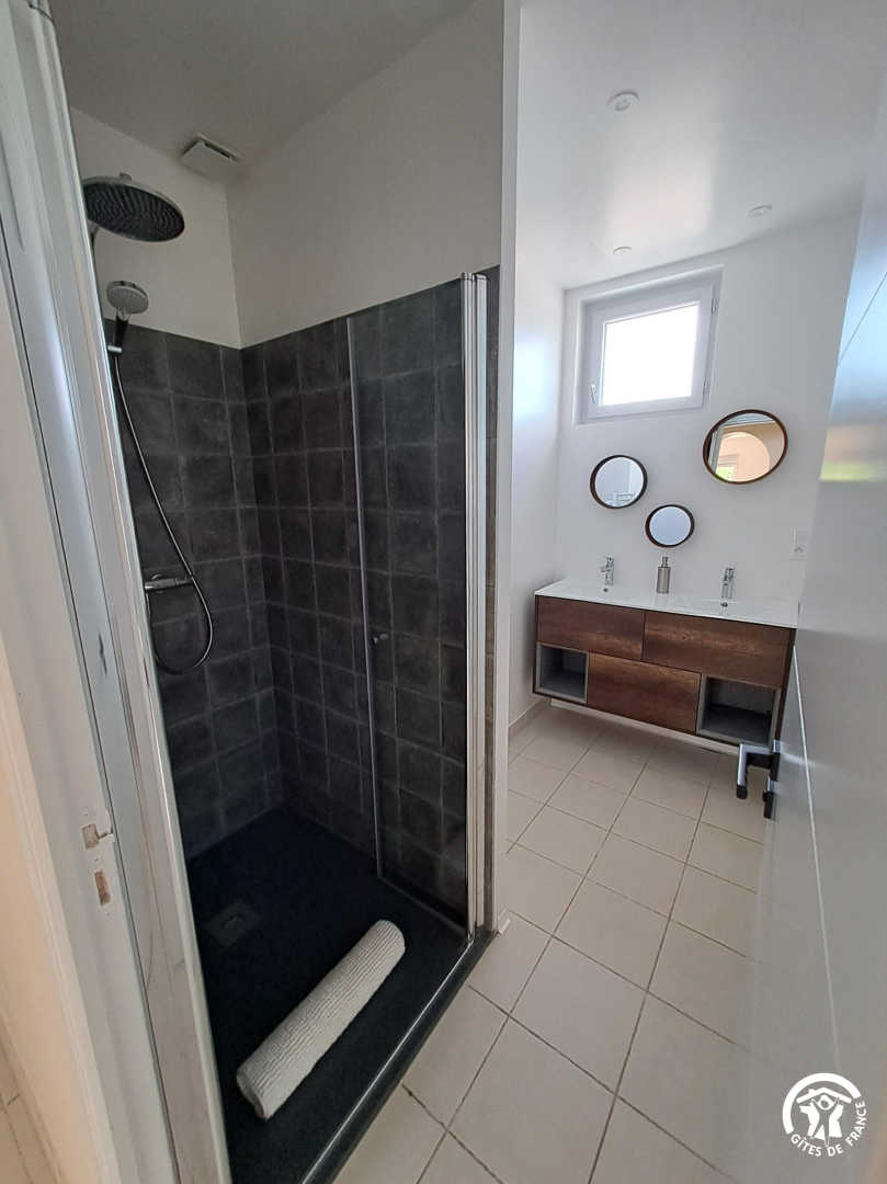 Rez-de-chaussée : garage, hall d’entrée, grande salle de bain, deux chambres (chacune avec lit double 160×200) dont une avec balcon et l’autre avec accès direct au-devant de la maison.