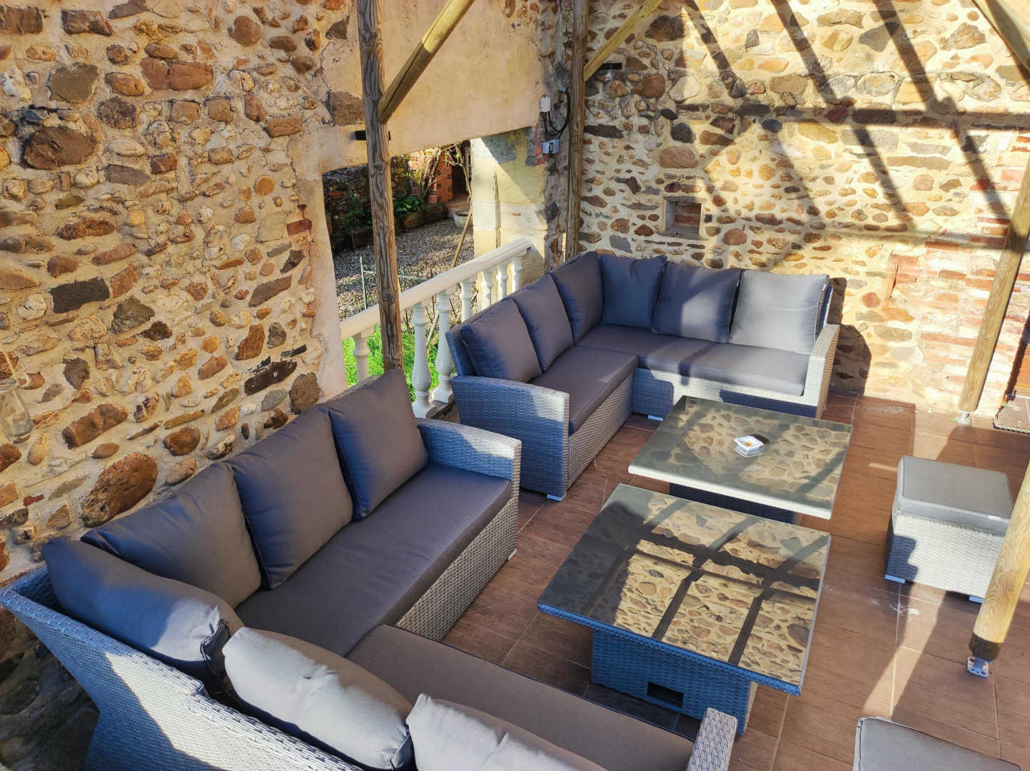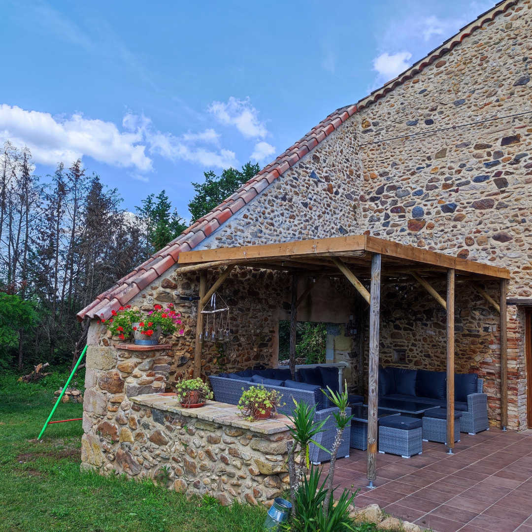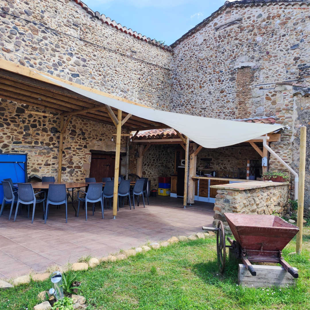 Depuis la buanderie : accès à la seconde terrasse extérieure couverte avec salon de jardin, table et cuisine d’été toute équipée.