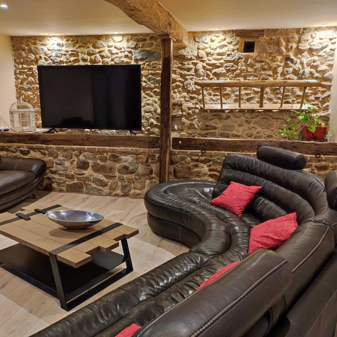 – Salon dans l’ancienne écurie avec ancienne mangeoire. Canapés et TV connecté à la télé d’Orange