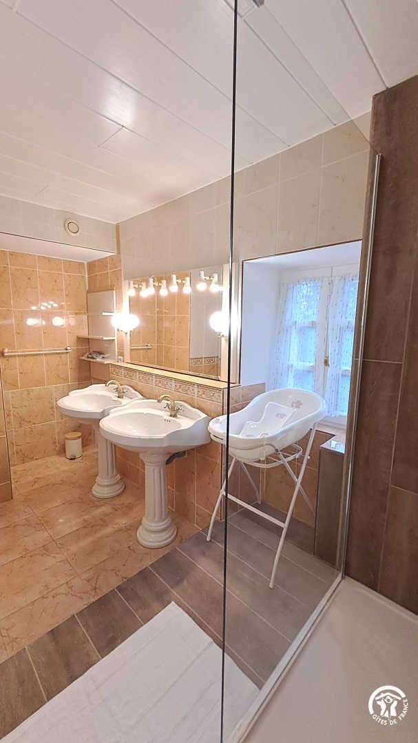* Une salle d’eau avec deux lavabos et grande douche à l’italienne.