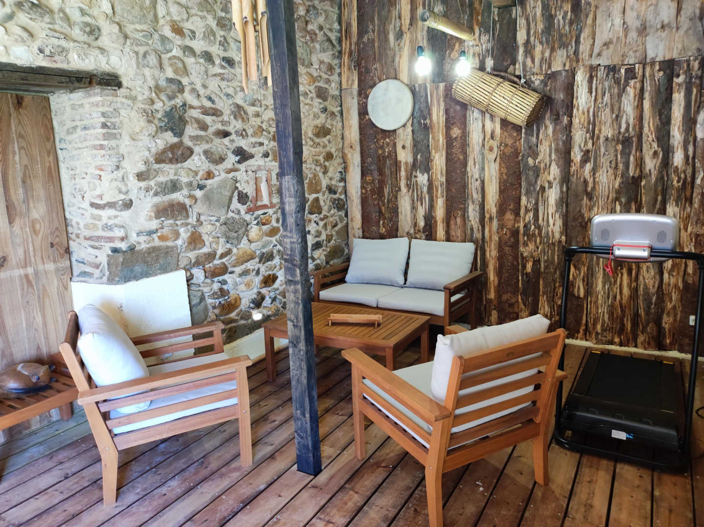 Face à la piscine, sous un abri dans une ancienne grange en pierre : jacuzzi 5 places accessible toute l’année et espace de remise en forme avec tapis de marche électrique, tapis de sol pour le yoga.