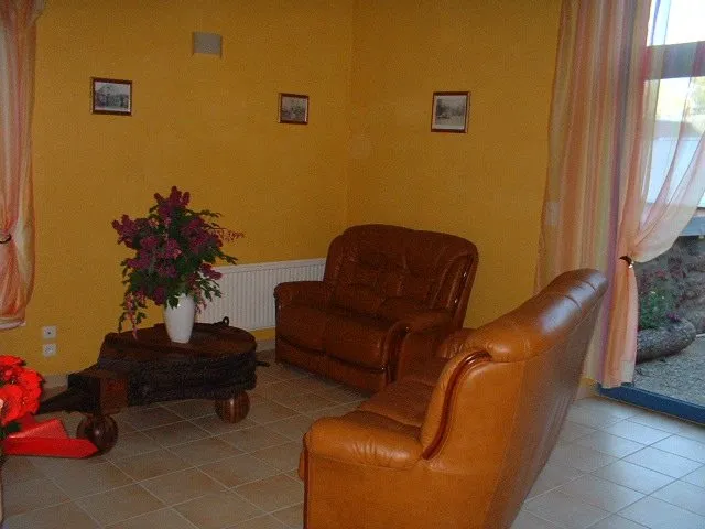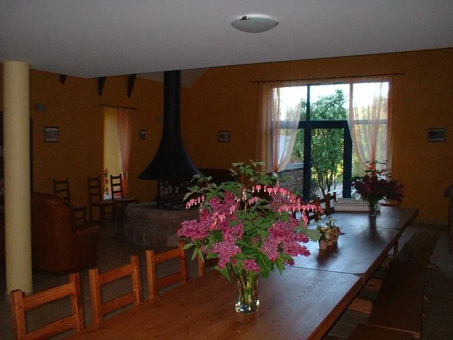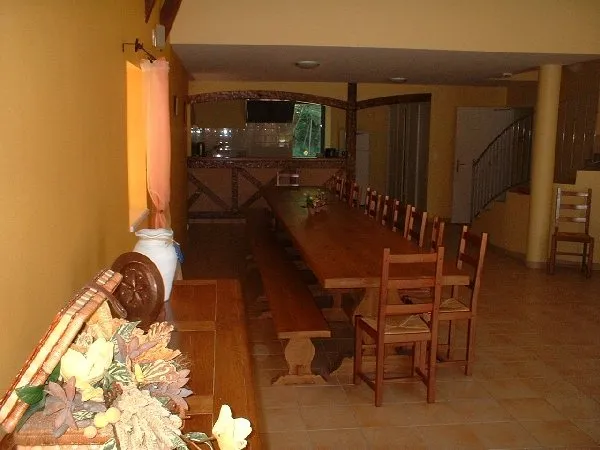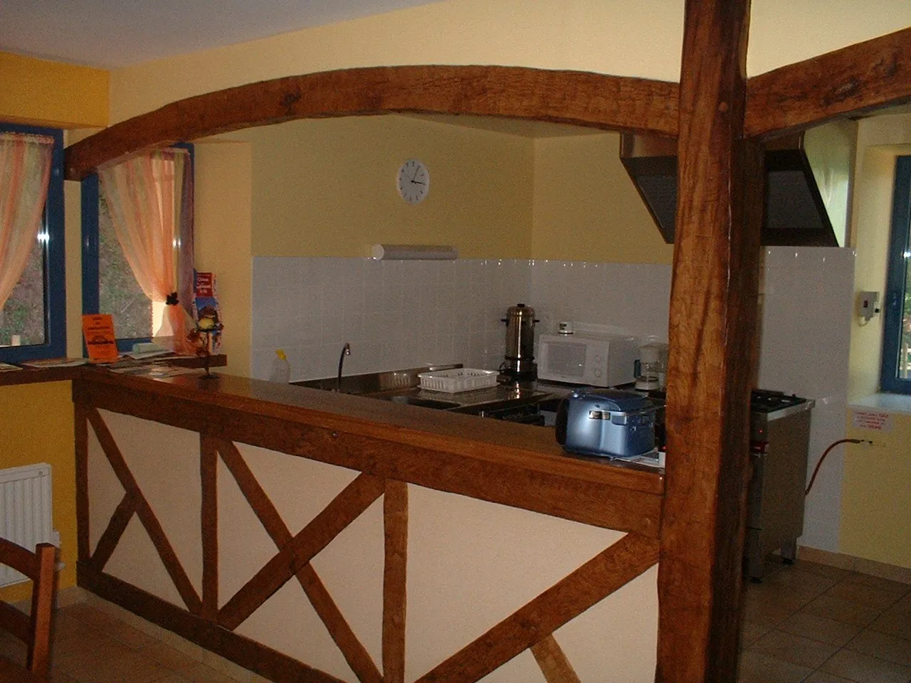Rez-de-chaussée : Salle commune de 80 m² avec coin repas et salon (Télévision, DVD, Bibliothèque,..) cheminée centrale, cuisine équipée (Lave-vaisselle, four, plaque)