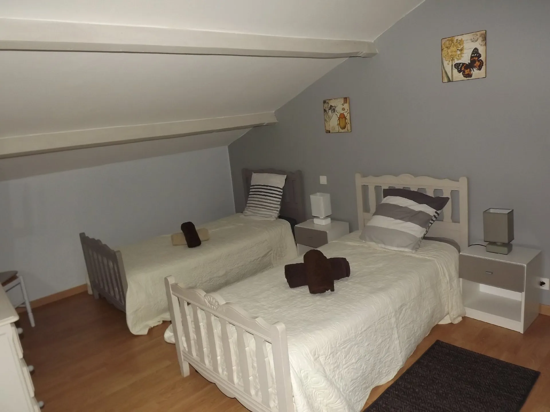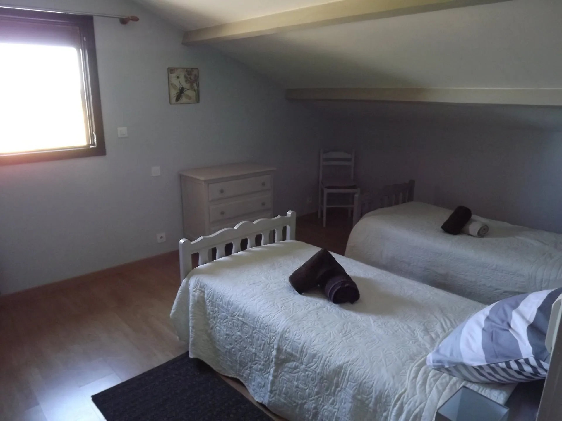 Al piano superiore: una camera con letto matrimoniale (140 cm), una camera con due letti singoli (90 cm), bagno con doccia e WC. Aria condizionata al piano superiore.