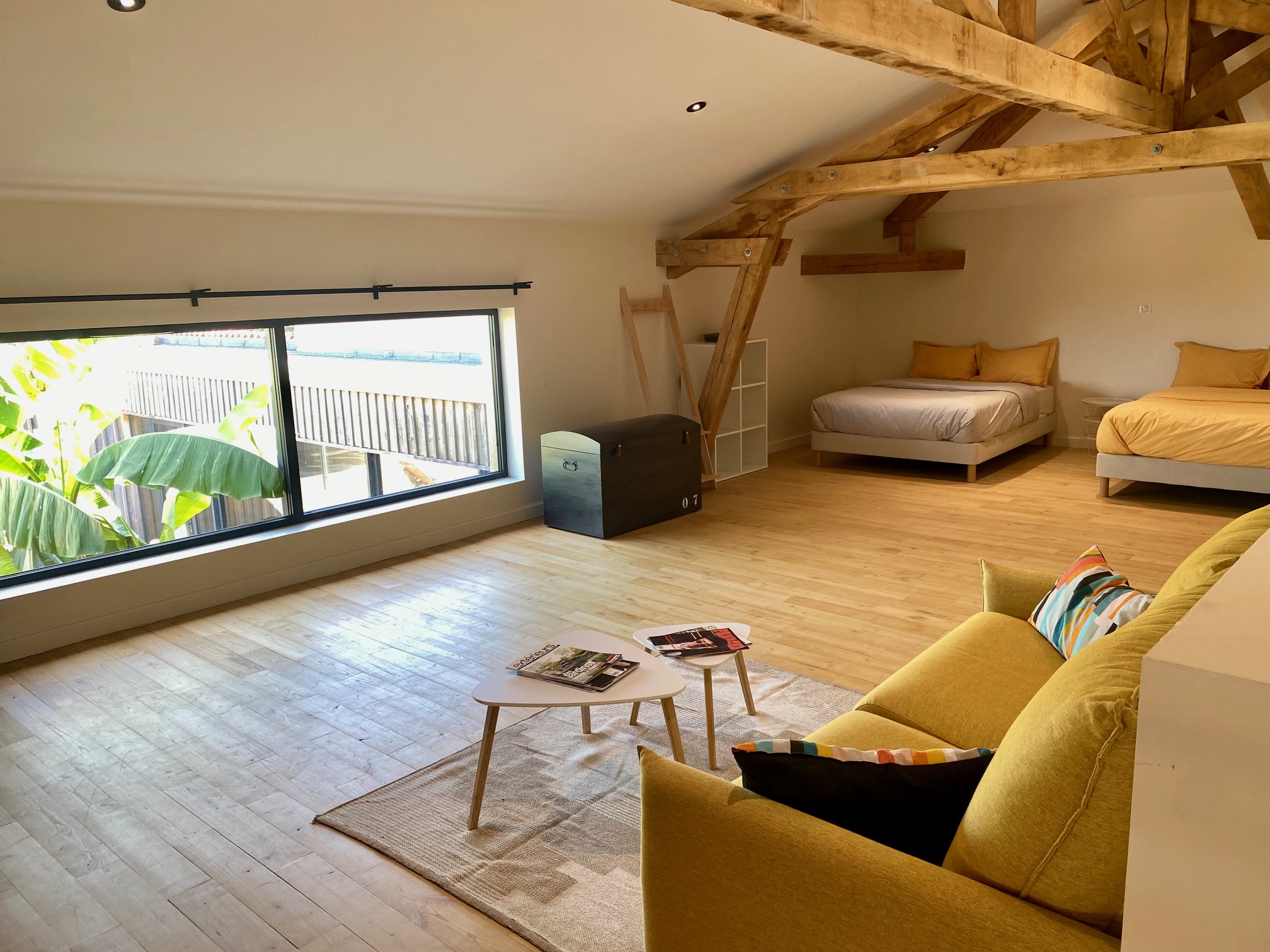La pièce de vie comprend une cuisine entièrement équipée/salle à manger ainsi que le salon avec télévision de 85’, canapé, insert pour une surface de 130 m².