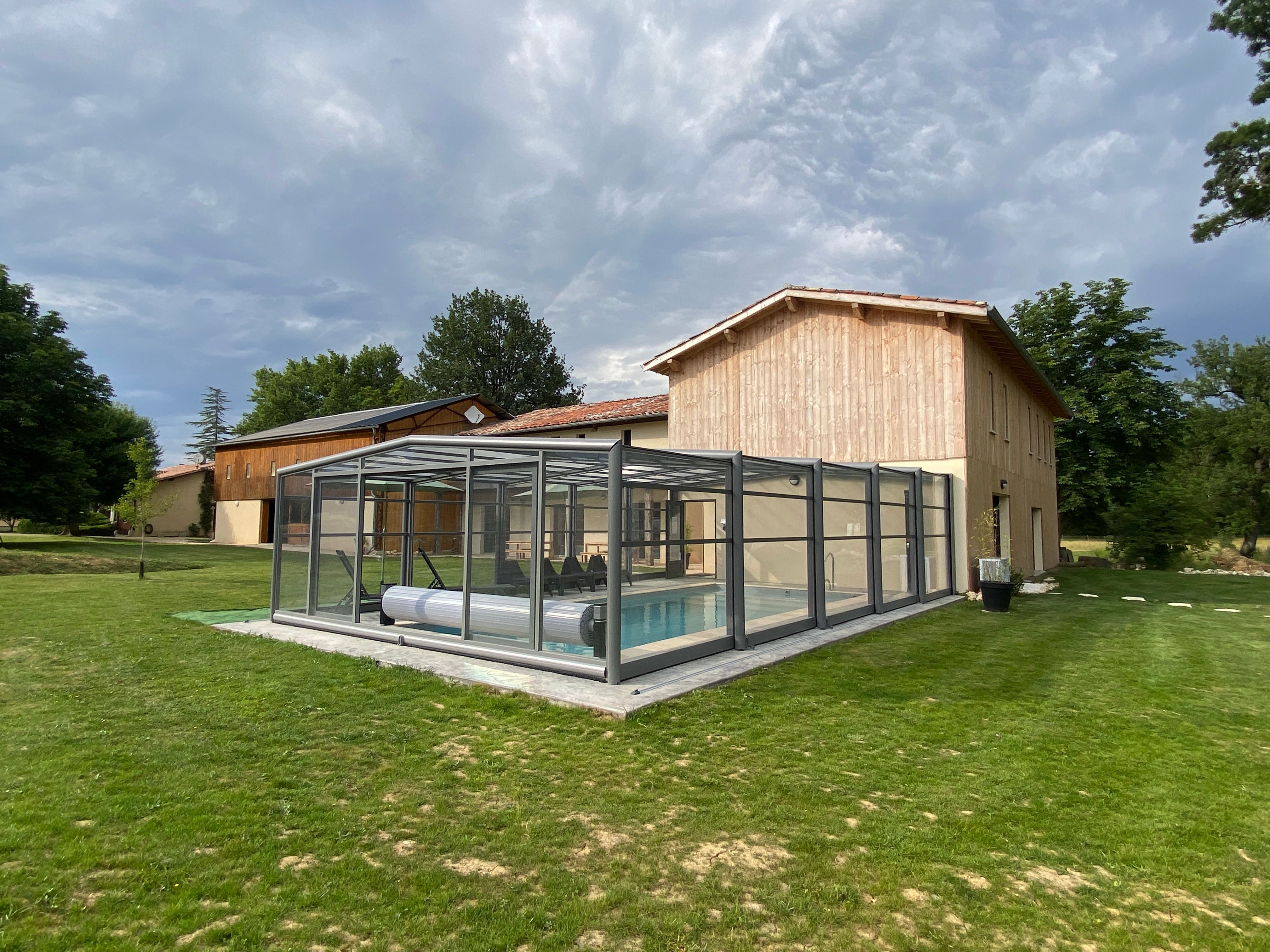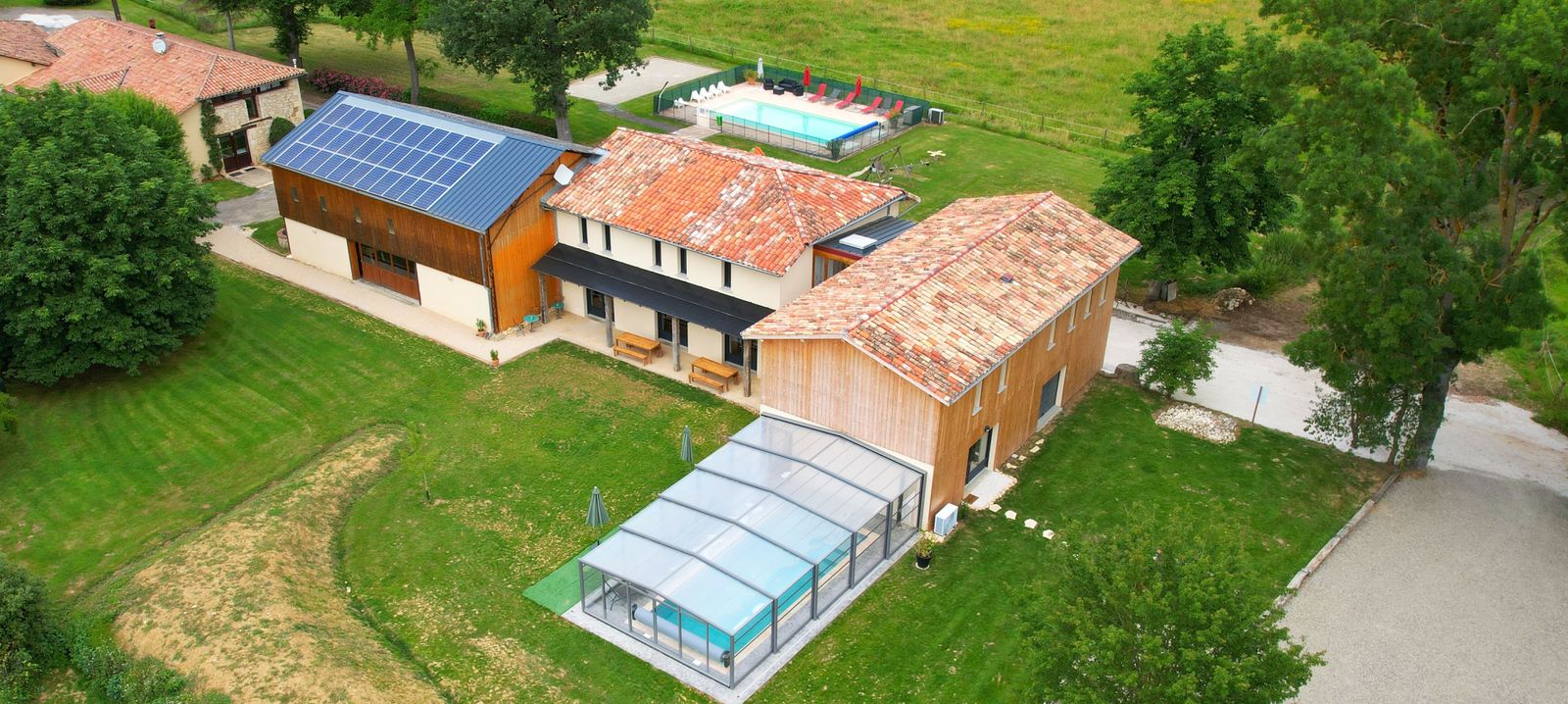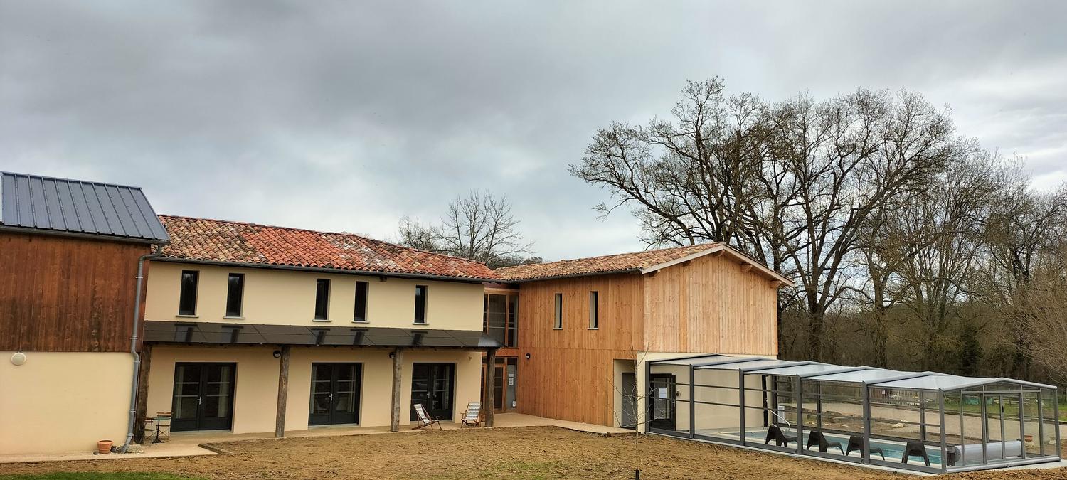 At the foot of the fortified village of Maubec, gateway to the Gers, this former Lomagnol farmhouse has been transformed into an exceptional hospitality estate: two group gîtes, guest rooms, two swimming pools, a games room, a yurt… in an agricultural setting that exudes country charm. The latest addition, Les Granges, is housed in two former hay and tobacco barns and can accommodate 26 people in rooms with en suite facilities. A large reception room is available for tasty meals with family and friends. The lounge with its large sofas invites you to relax, while the covered and heated swimming pool, reserved for the gîte, can be used all year round. Walks and mountain bike rides depart from the estate.