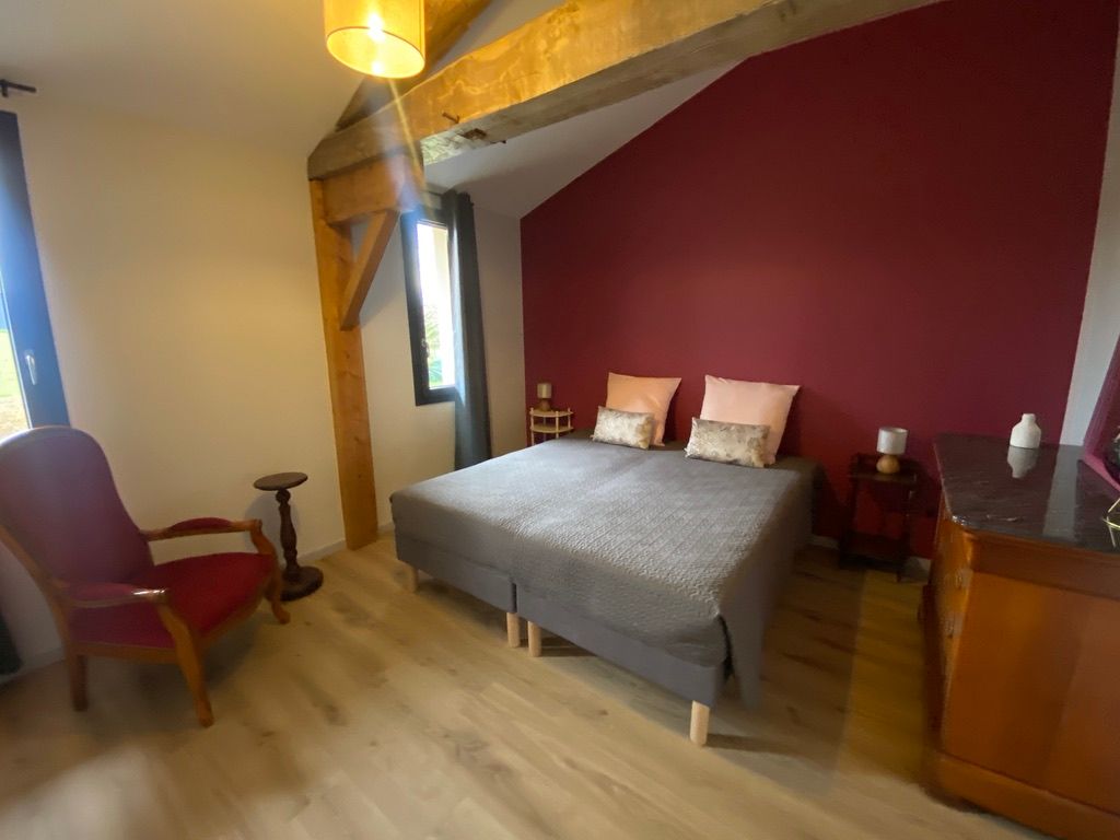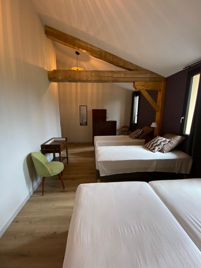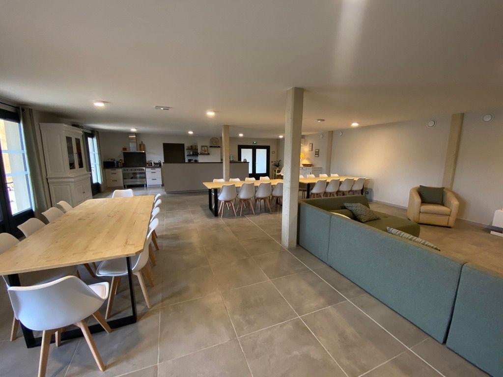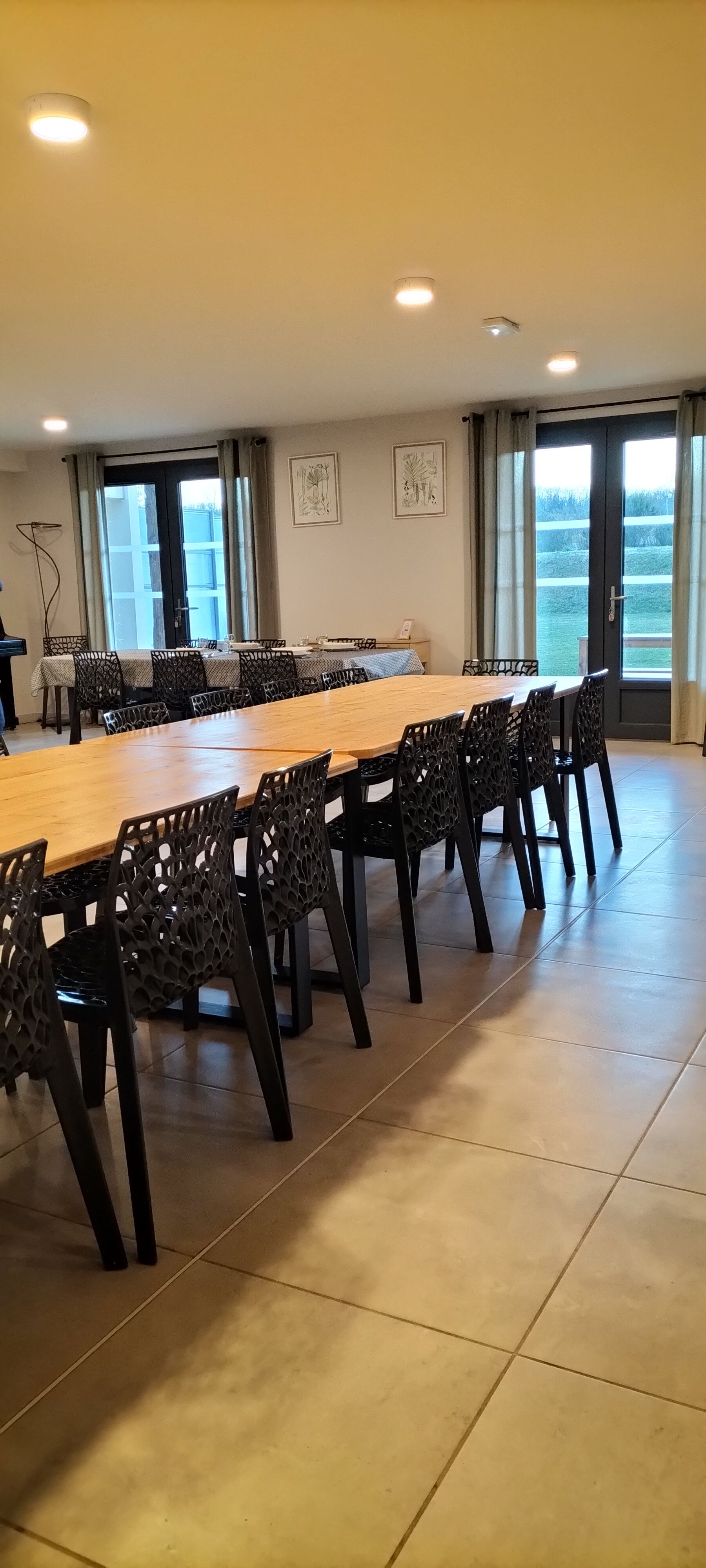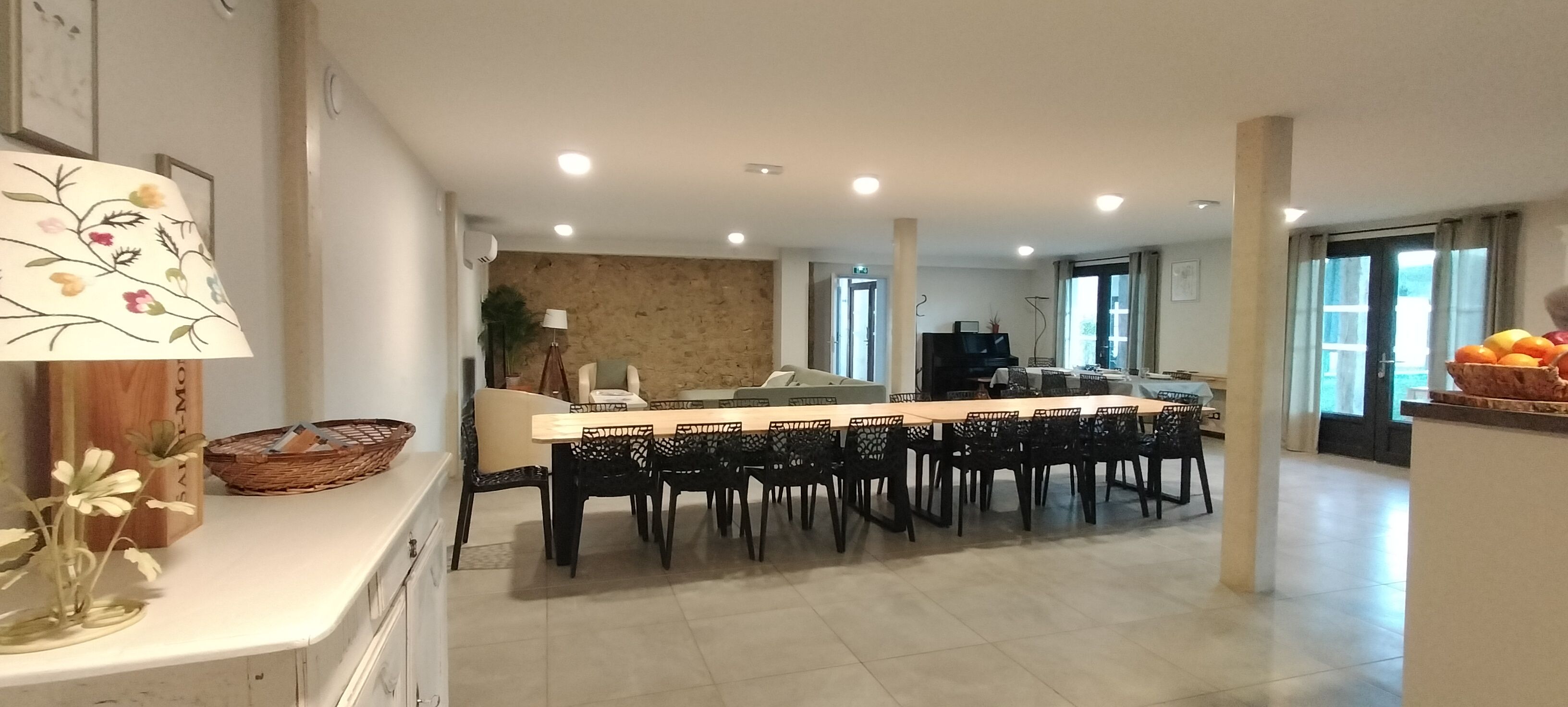 The ground floor includes a PRM studio (bedroom with modular beds, shower room and toilet), a living area with integrated kitchen and a large, fully-equipped reception room (semi-professional kitchen, tables for 30 guests, lounge with TV). Upstairs, comfortable bedrooms: on the tobacco barn side, 2 double bedrooms and 2 quadruple bedrooms with en suite facilities; on the hay barn side, a similar layout.