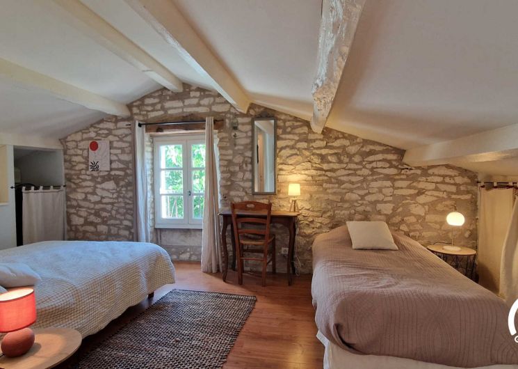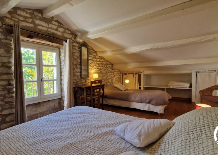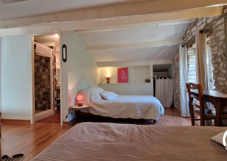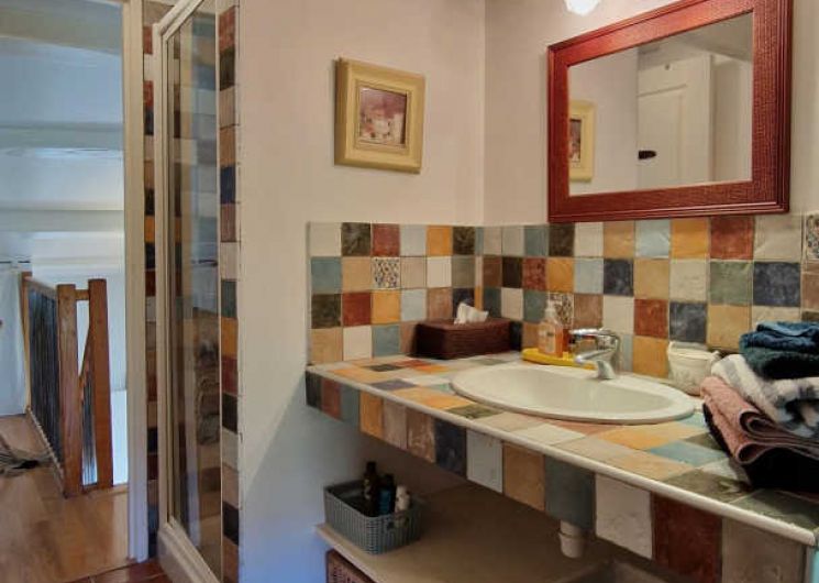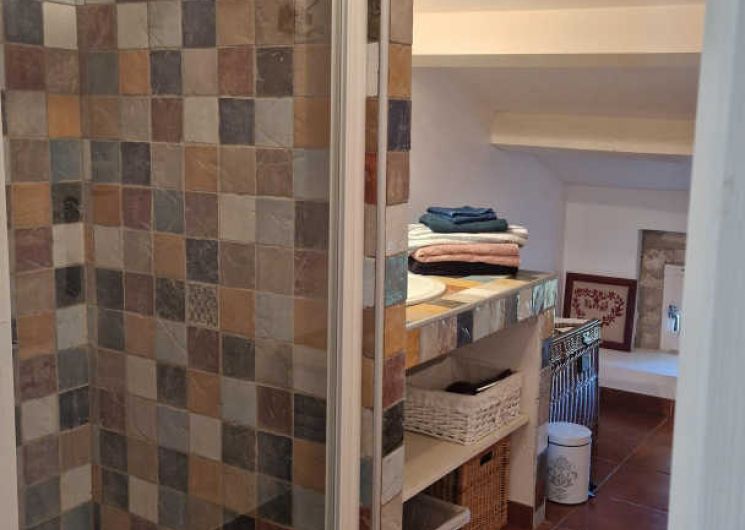 A l’étage, une chambre ouverte sur l’escalier et climatisée équipée d’un lit double en 140x190cm et un lit simple en 90x200cm; ainsi qu’une salle d’eau (douche et vasque).