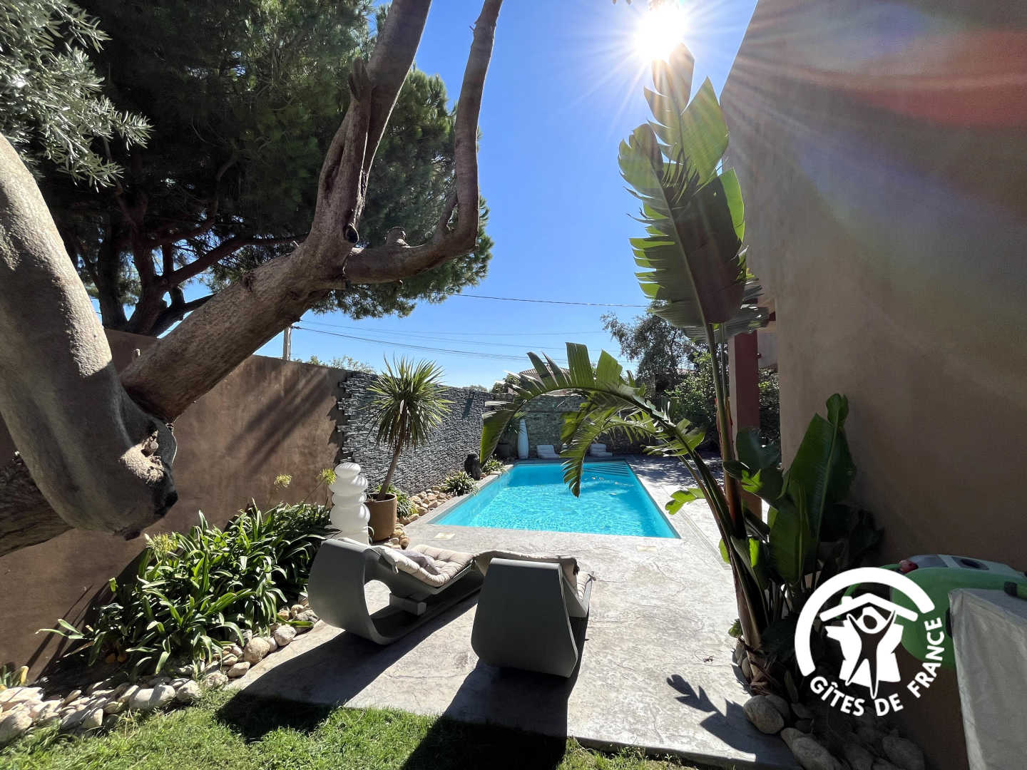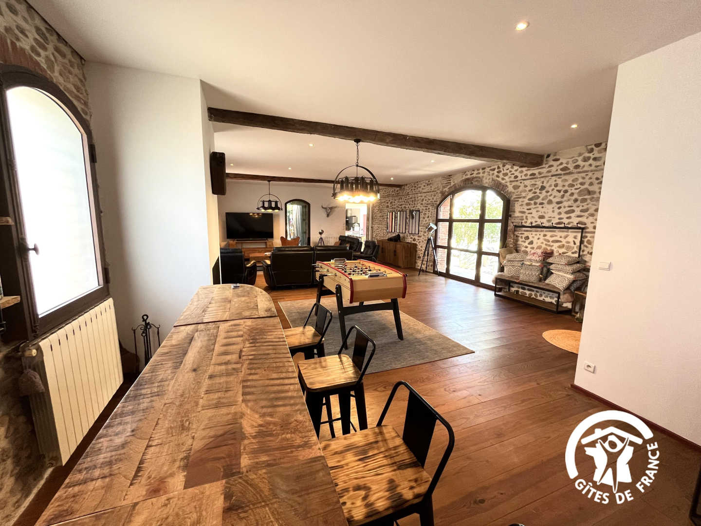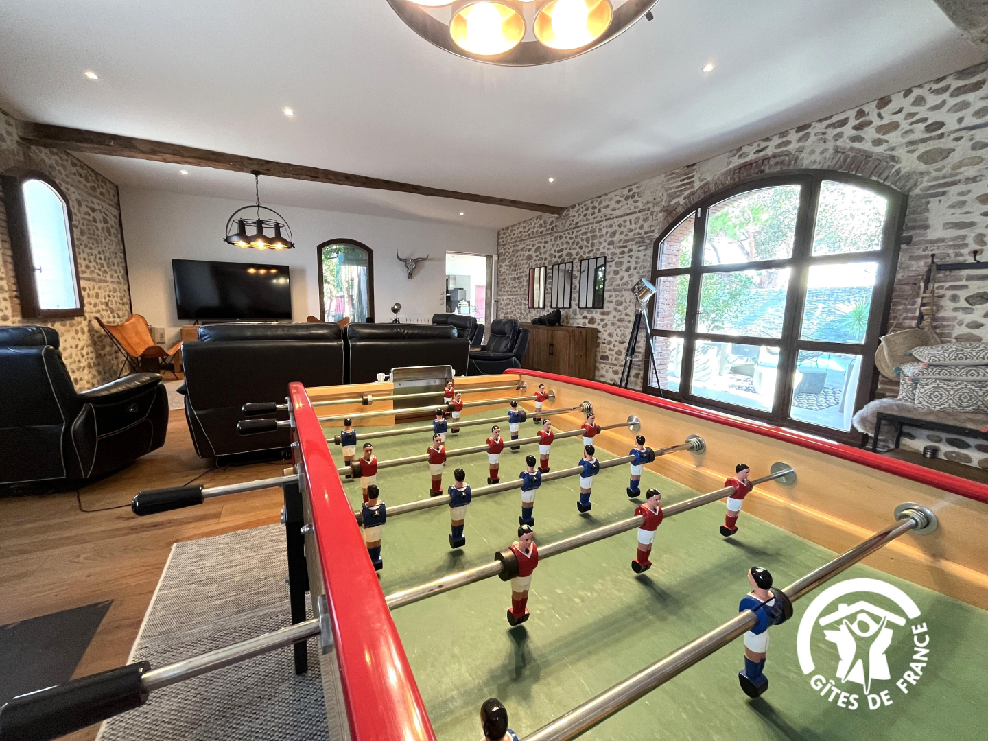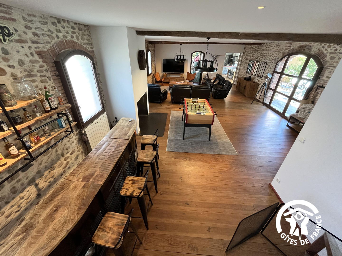 Just a stone’s throw from Perpignan, in the heart of the Roussillon region, stay in a beautiful, unusual residence close to many of the major tourist attractions in the Pyrénées-Orientales. You will enjoy a beautiful swimming pool secured by an alarm (4.5 m x 8.5 m. depth 1.70 m, accessible from May to October). Inside, on the ground floor: fully-equipped kitchen, large, very comfortable living room (bar area, table football, fireplace and pinball machine as decorative features), 1 en-suite bedroom (1 double bed 160×200) with private shower room and wc. Upstairs: 1 large master bedroom (1 double bed 160×200) with private bathroom and wc, 2 large bedrooms (each with 1 double bed 160×200) with shared shower room and wc. Outside, a self-contained ground-floor bedroom with shower, bath and private wc (good quality double sofa bed 150×190).