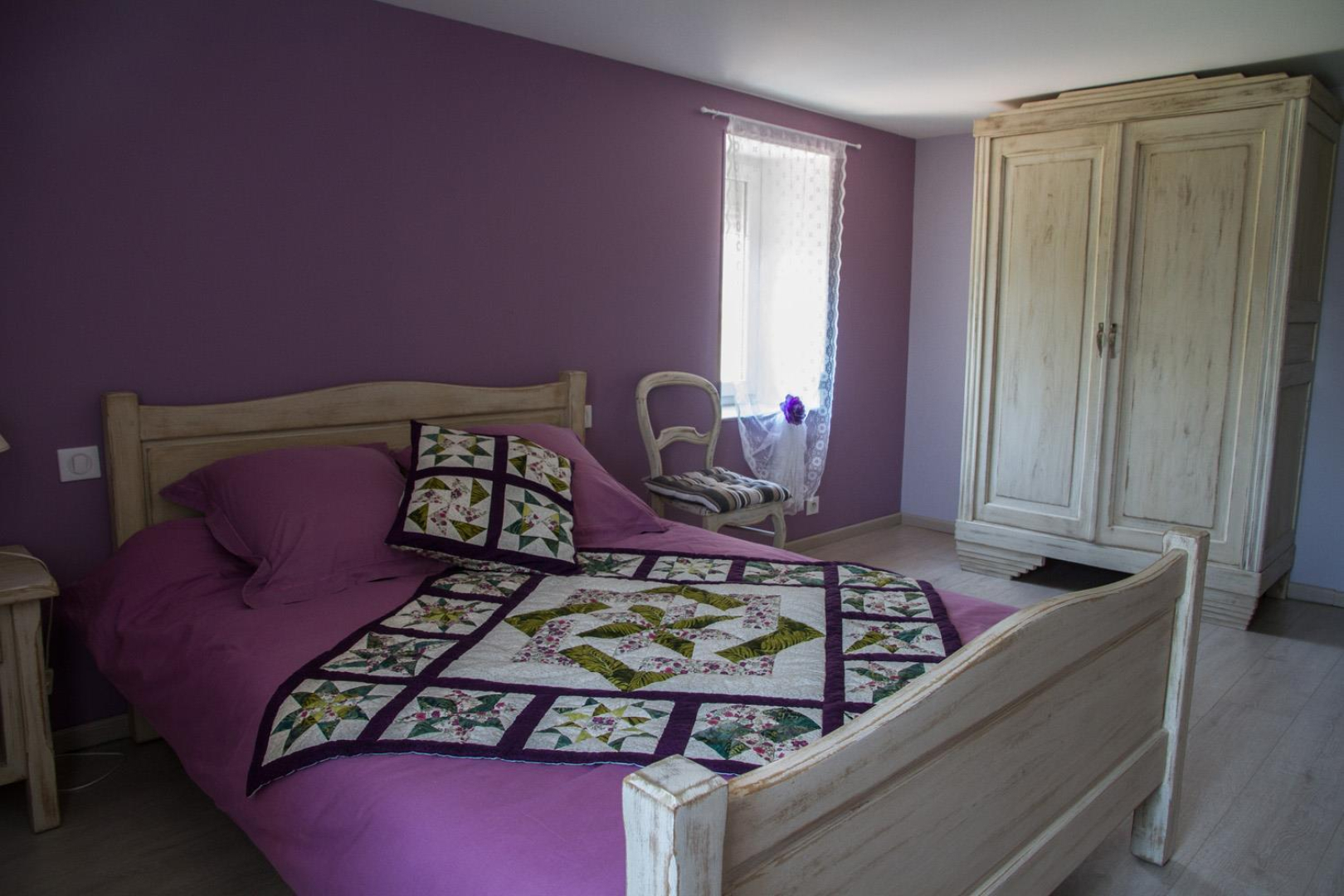 A l’étage : deux chambres (un lit double en 140×190 dans l’une, trois lits simples 90×190 dans l’autre), salle d’eau, wc.