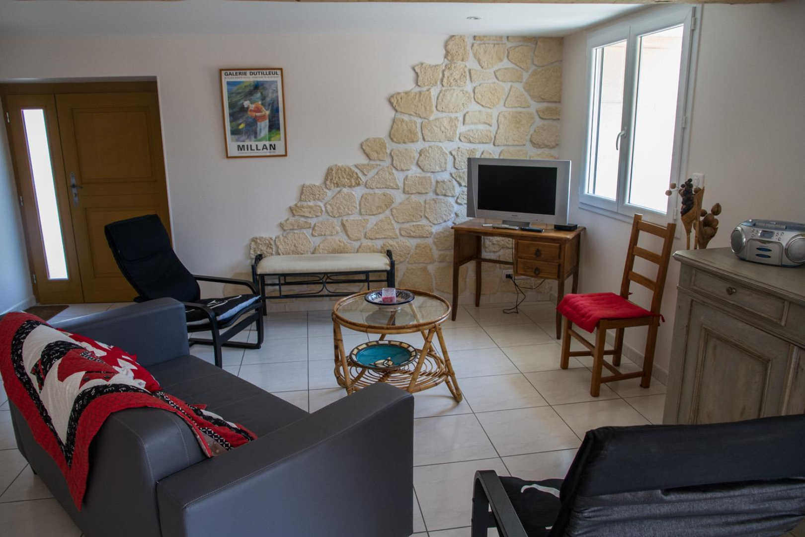 Rez-de-chaussée : pièce à vivre avec coin salon et cuisine ouverte toute équipée, donnant sur la terrasse (lave-linge, lave-vaisselle, réfrigérateur-congélateur, four électrique, plaque 4 feux gaz, micro-ondes, etc…).