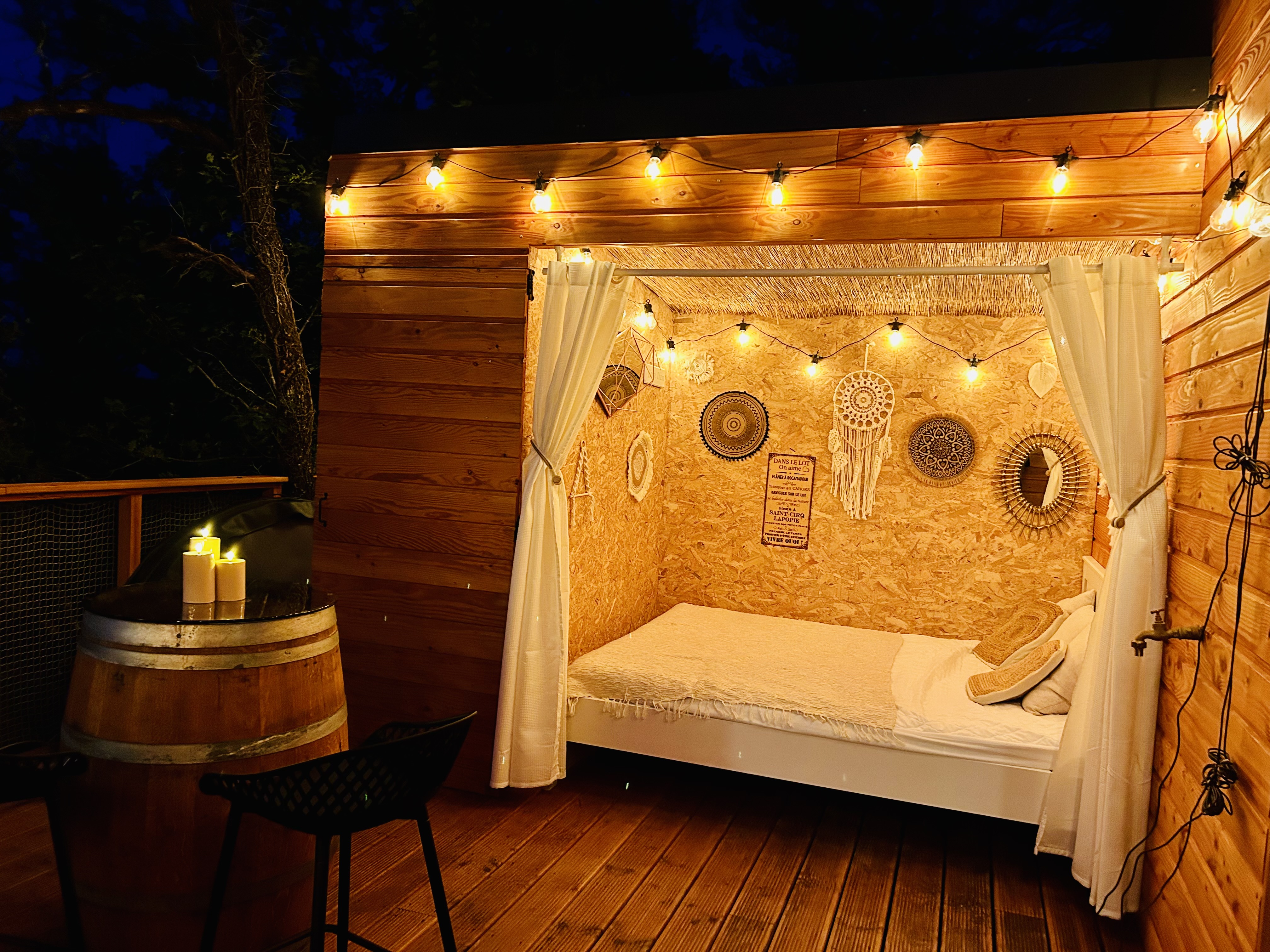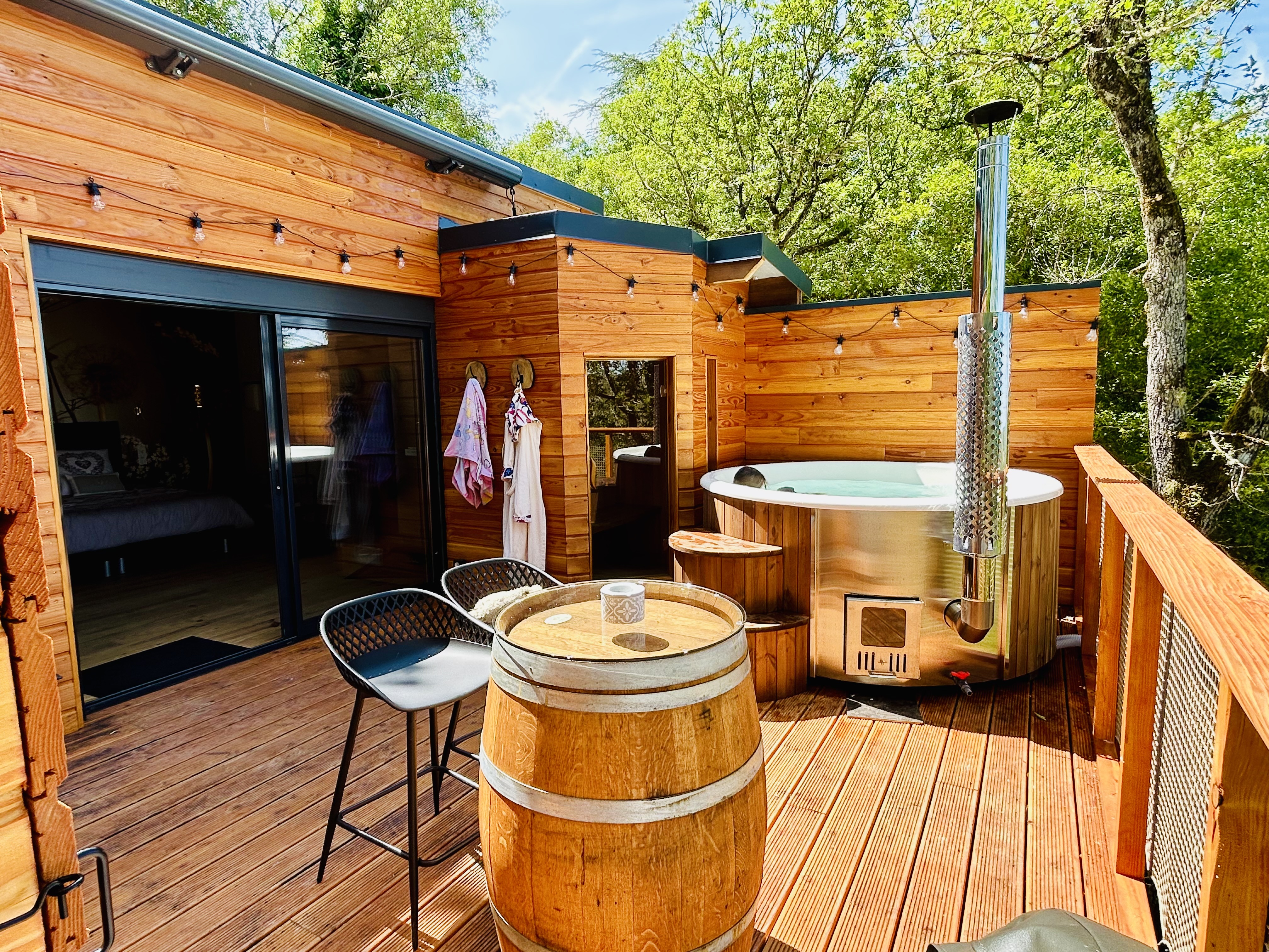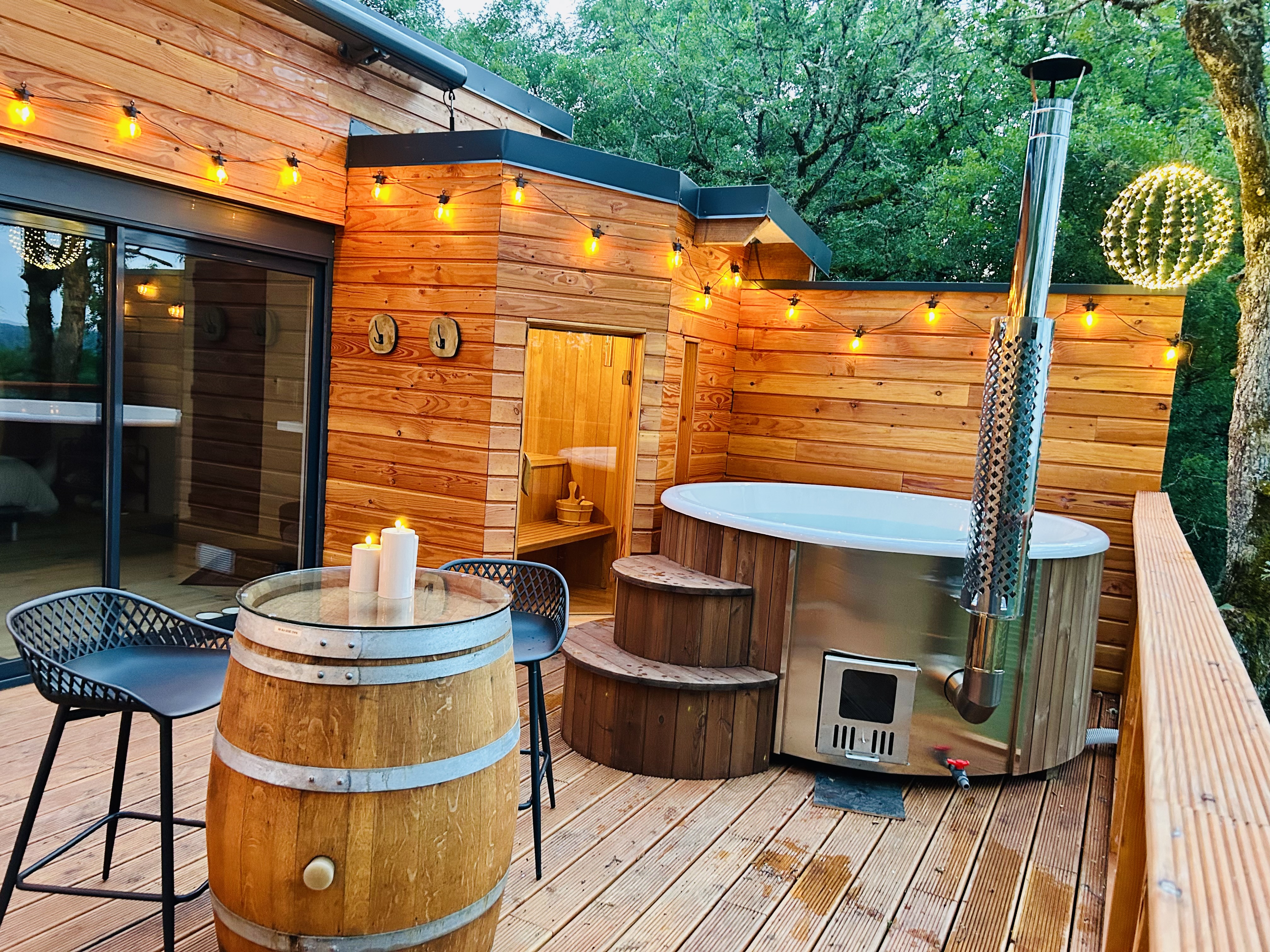 La Cabane du Prestadou – Bain nordique & Sauna Évadez-vous au Domaine du Prestadou et découvrez notre cabane d’exception, pensée pour conjuguer confort haut de gamme et communion avec la nature • Lit King Size 200 x 200 • Véritable Sauna traditionnel aux pierres chaudes • Bain nordique suédois, chauffé au feu de bois • Terrasse panoramique • Lit extérieur 160×200 • Superbe douche à l’italienne en marbre • Cuisine équipée • Tv écran plat • Climatisation réversible Apéritif et Petit déjeuner de bienvenue