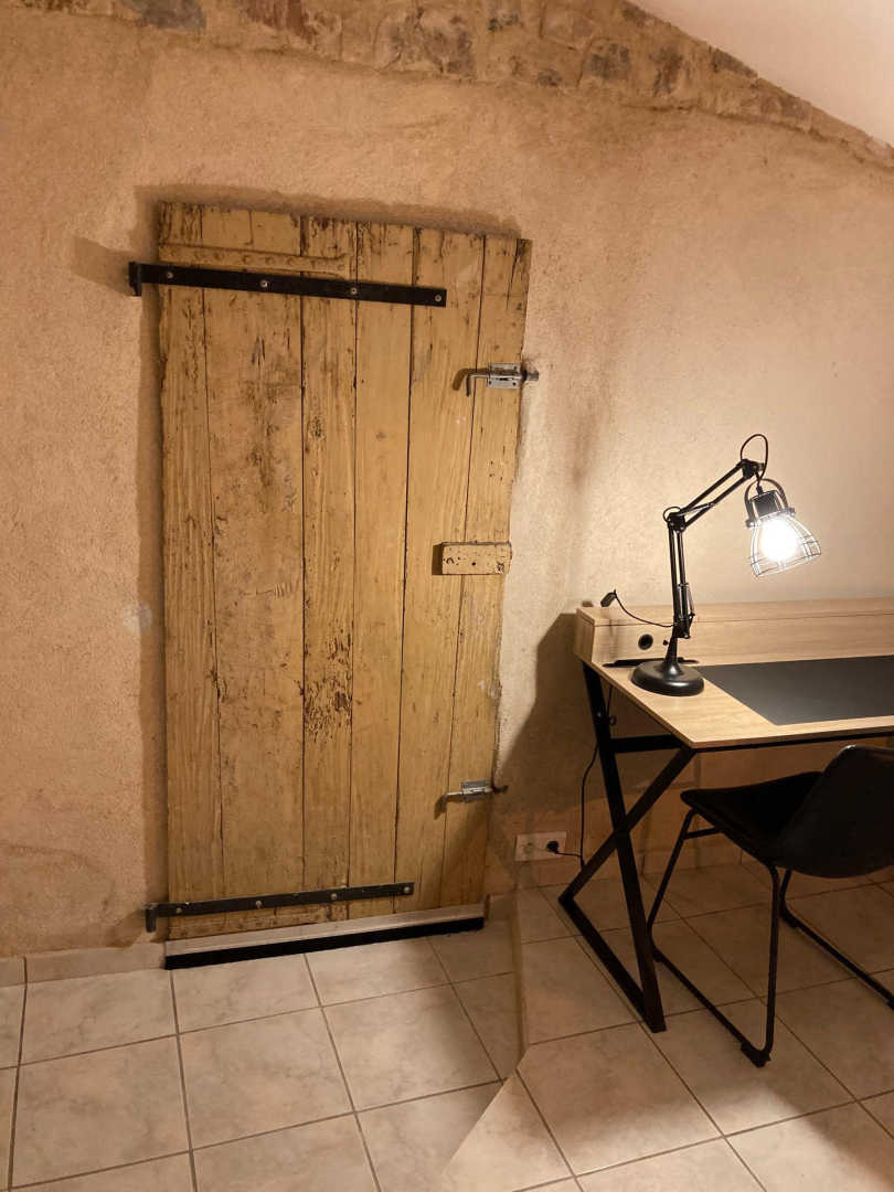 Depuis le salon, accès à la chambre parentale avec lit en 160x200cm, bureau et accès direct à l’extérieur.