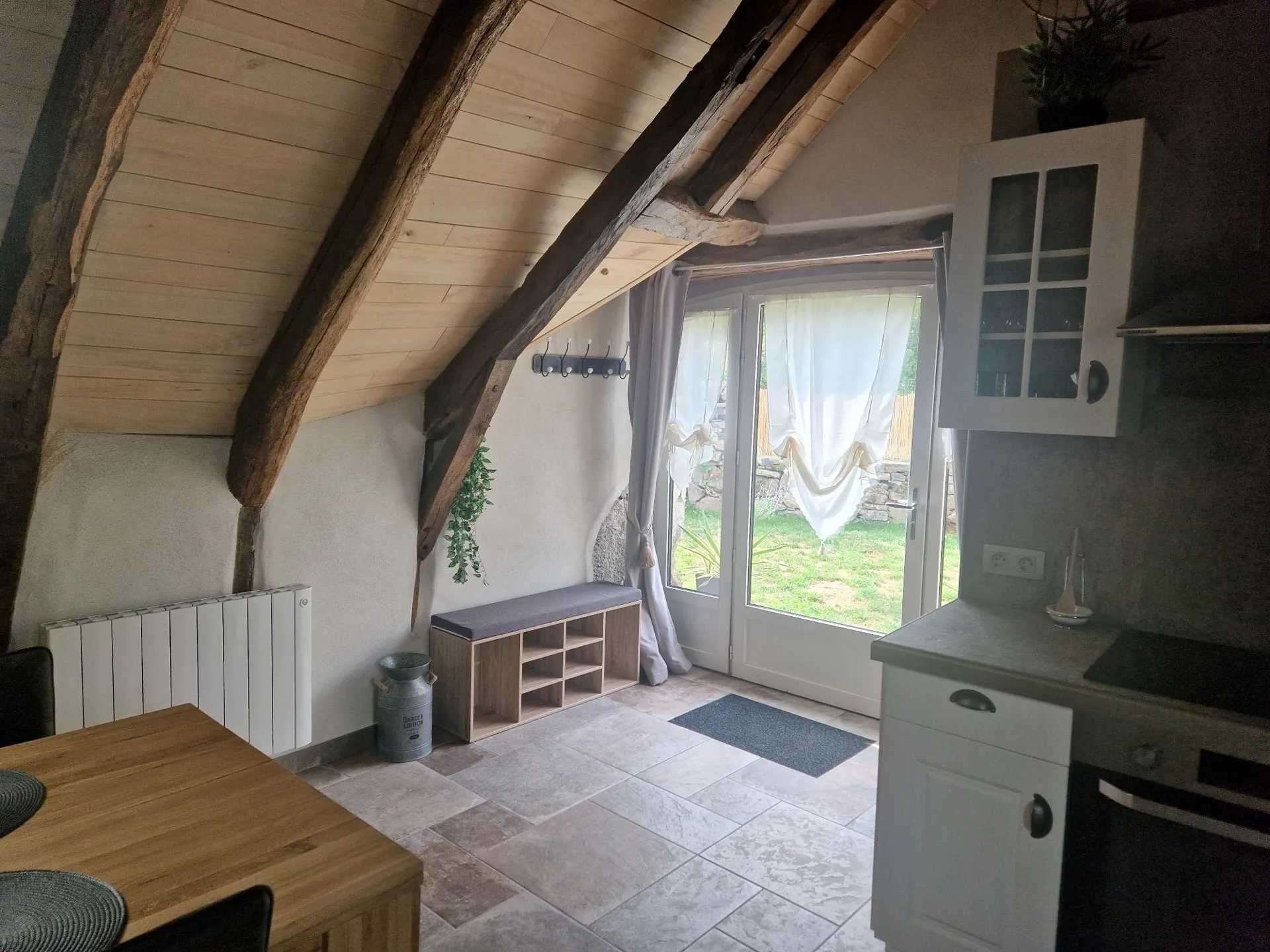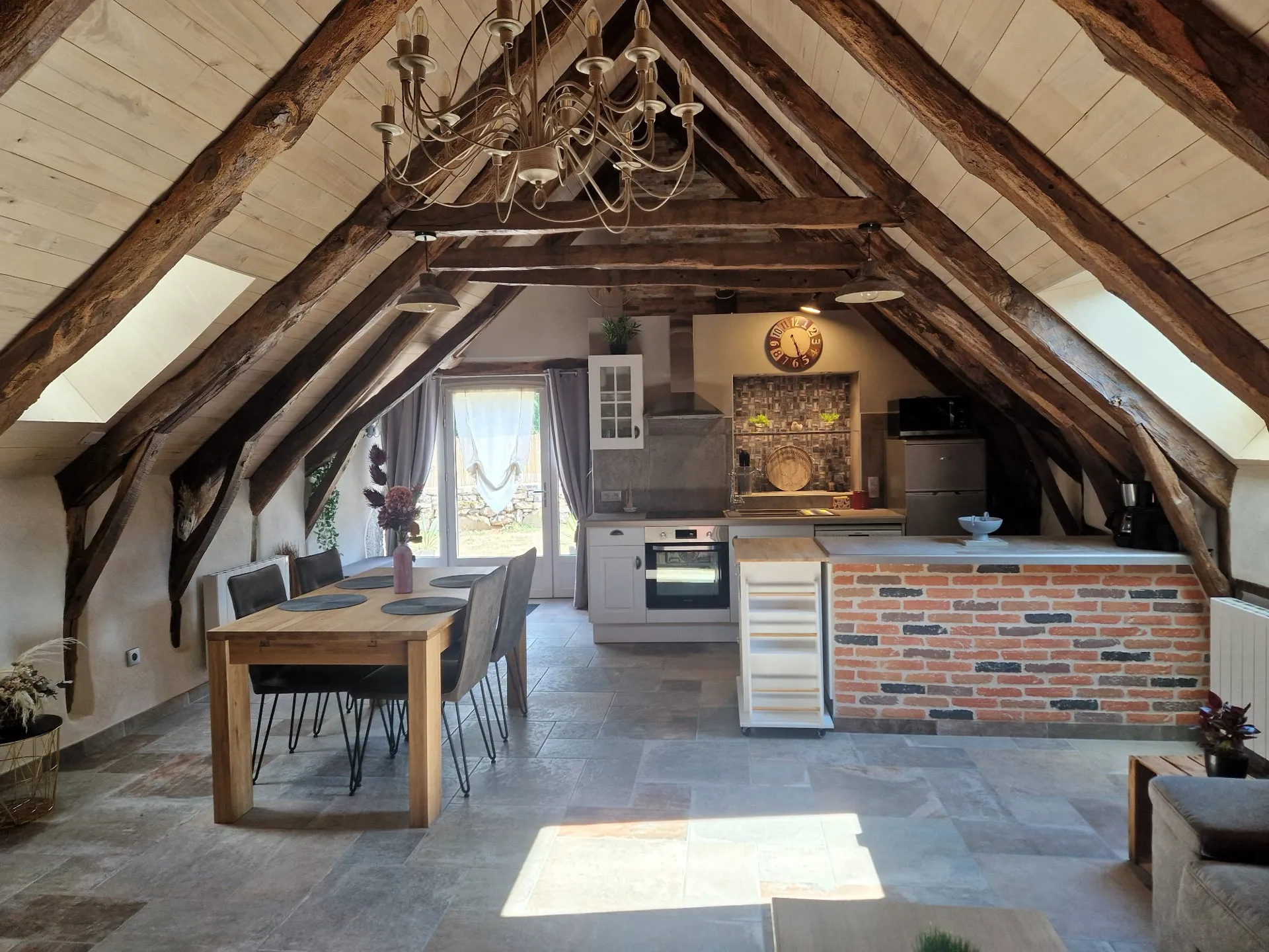 Sur l’Aubrac, grange rénovée en gîte de charme d’environ 60 m² avec ses belles poutres apparentes qui agrémentent l’ensemble.