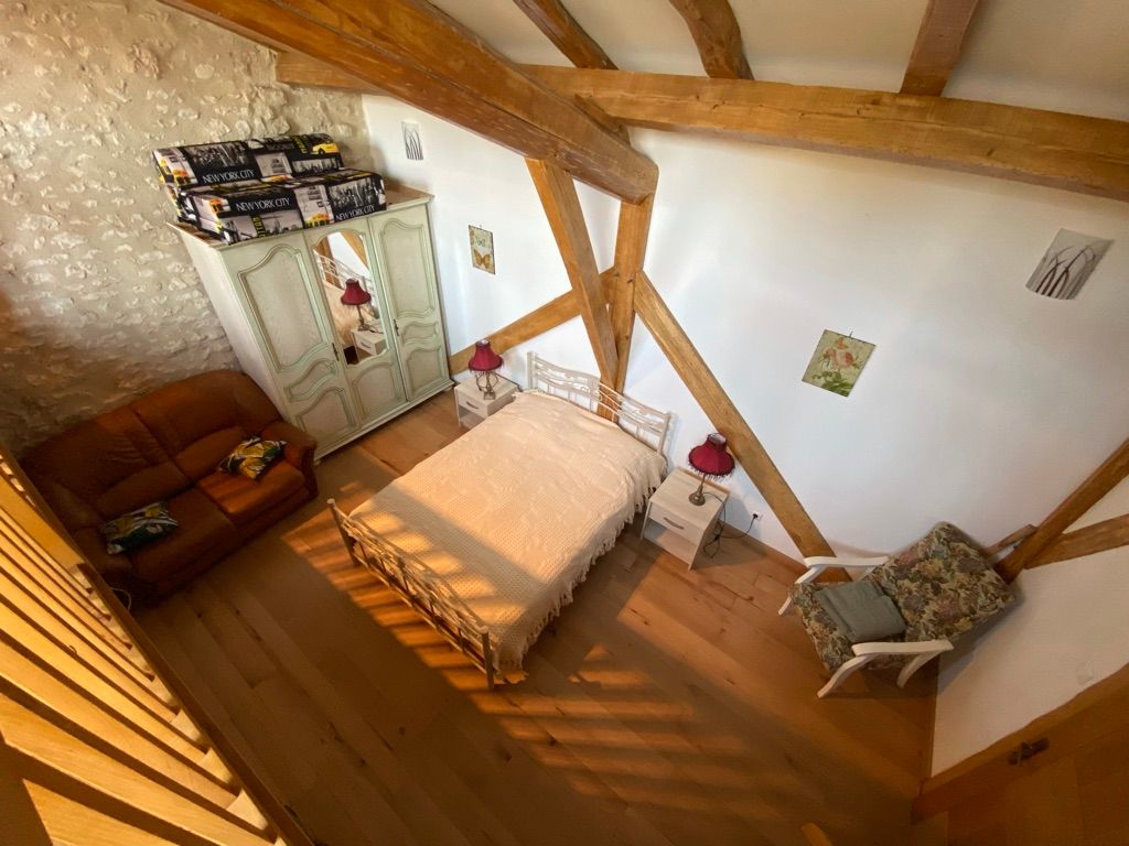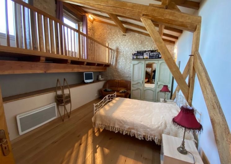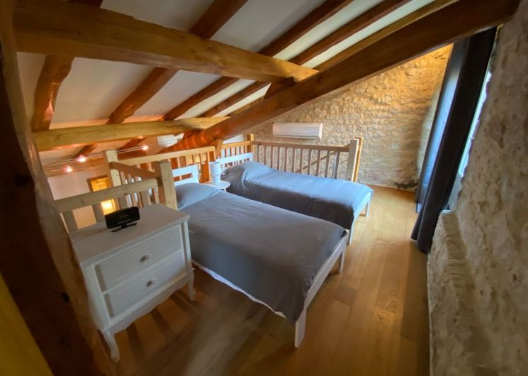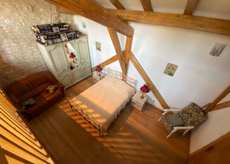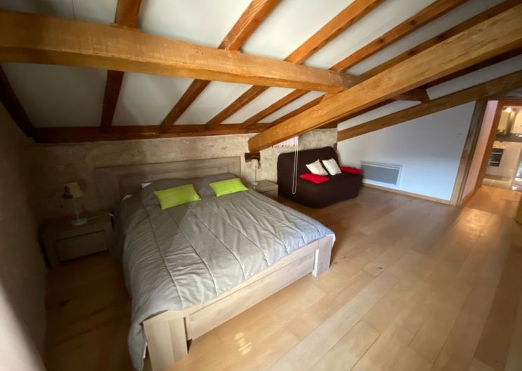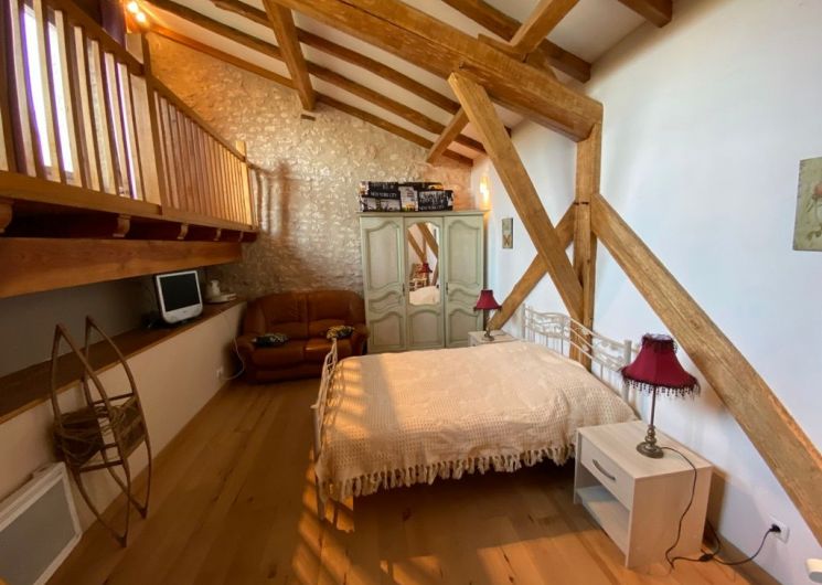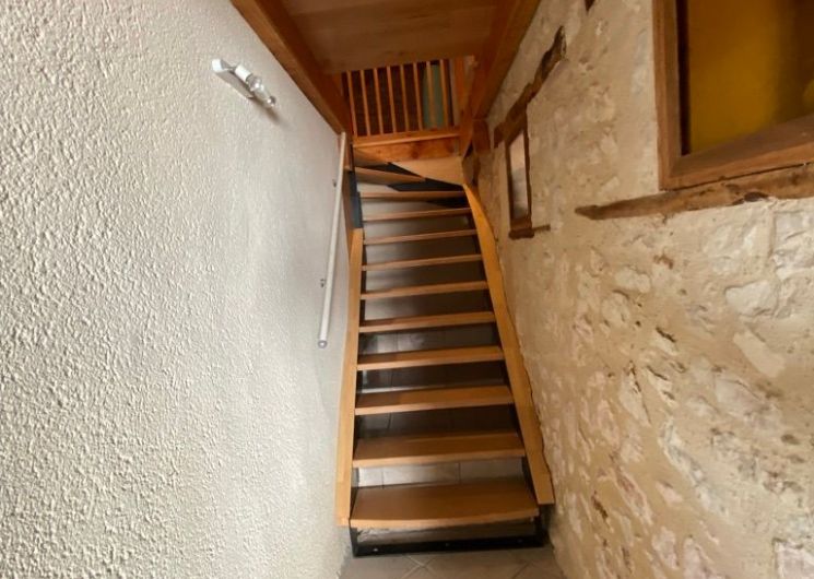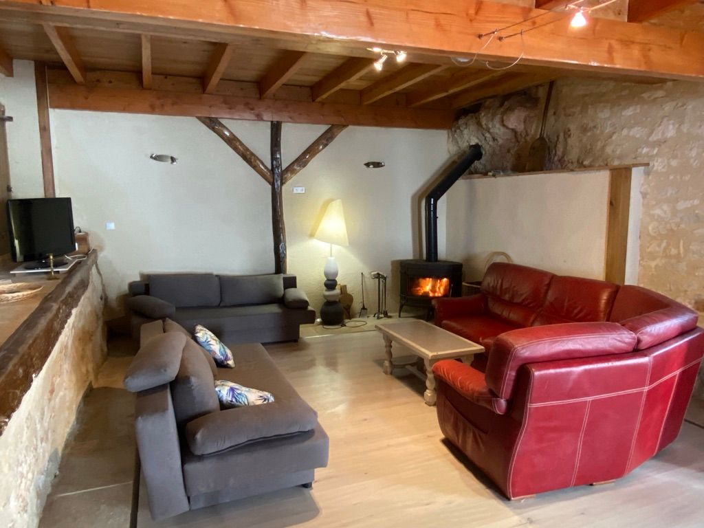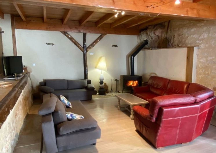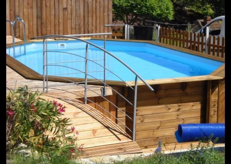 The ground floor comprises a living room (sofas, armchairs, wood-burning stove, TV) opening onto the dining room with built-in kitchen (dishwasher, microwave, hob, fridge, freezer). One step leads to the shower room with wc. A staircase takes you to a landing leading to: 1 bedroom (1 x 160cm bed, 1 x 2-person bz), 1 alcove (1 x 140cm bed), 1 bedroom (1 x 140cm bed), 1 shower room with wc. Another staircase leads to a mezzanine (2 beds 0.90). wifi in the gîte. Bed linen provided and included in the price for a minimum of one week’s rental. Towels optional. Private grounds with garden furniture and barbecue. The private above-ground swimming pool is located above the gîte, with deckchairs, garden table and chairs.