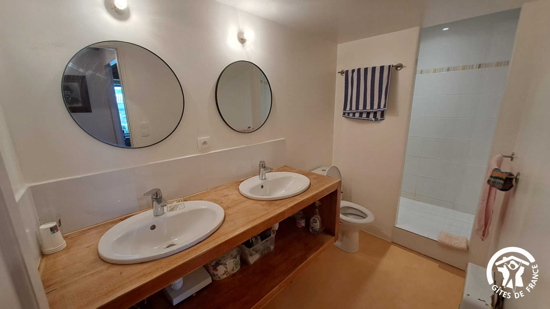 Sanitaire : une salle d’eau attenante à la chambre haute, avec double vasque, une douche et un wc.