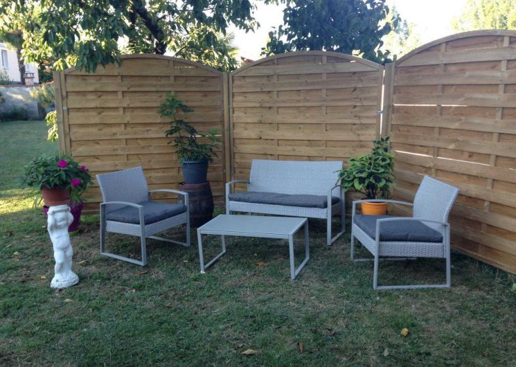 Au premier niveau : salon (2 canapés trois places dont 1 convertible, deux fauteuils, tv + internet), salle à manger lumineuse, cuisine toute équipée par laquelle on accède sur une terrasse et au jardin, salle d’eau, wc séparé.