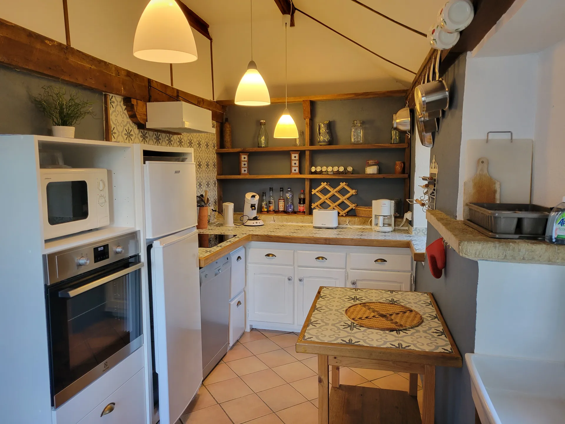4 chambres (2 lits 140, 4 lits 90, chambres sous combles climatisées), 2 salles d’eau, coin-cuisine (lave-vaisselle) / salle à manger (poêle à bois), salon (canapé, fauteuils, poêle à granulés, télévision, climatisation), petit salon (télévision, canapé, babyfoot), cave/buanderie (lave-linge, réfrigérateur supplémentaire), chauffage complet électrique.
