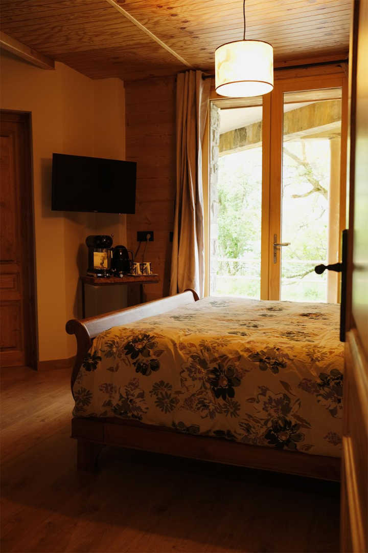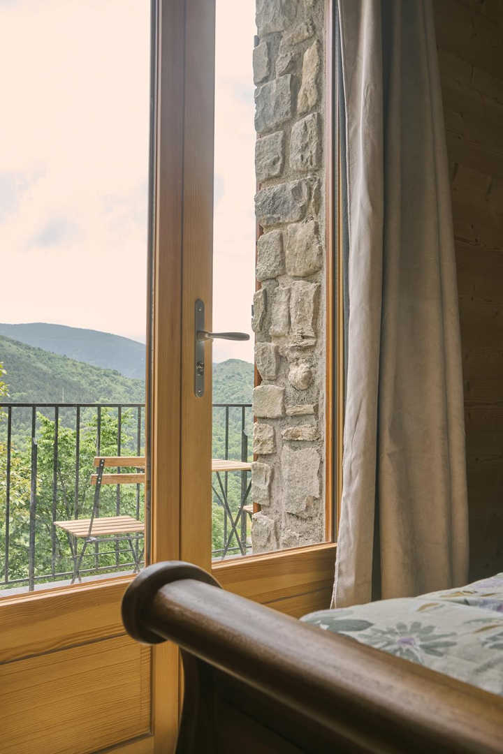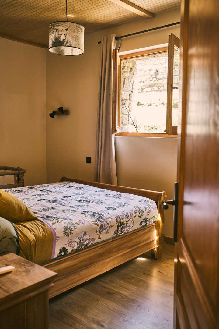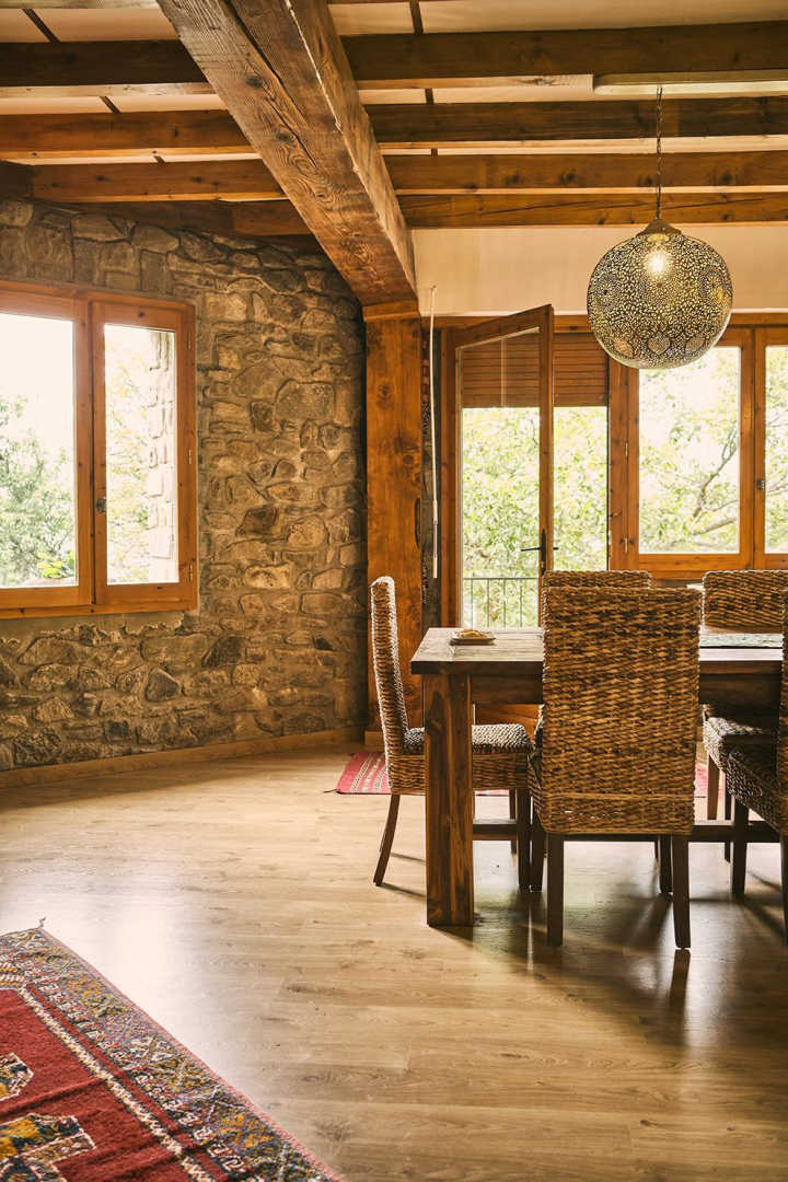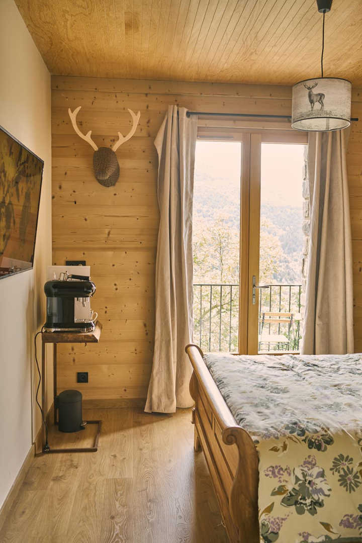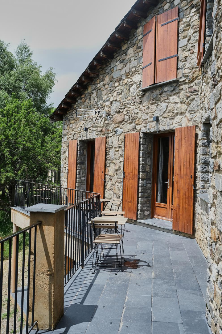 On the outskirts of the village of Llo, with uninterrupted views of the valley and mountains, this large, beautiful, fully renovated 570 m² building has 5 guest rooms, each equipped with a TV, tea and coffee making facilities and opening onto its own private terrace, as well as a shower room and toilet. Four of these guest rooms sleep 2 people and one sleeps 4. In the large living room with its open fireplace, you can enjoy your meal at the table d’hôtes, which can be booked in advance, prepared by Miguel and Toni, well-known names in Barcelona for their top-quality cuisine. From the very start of the day, you’ll be able to enjoy the surroundings, with your breakfast prepared with care by Miguel. Four of the five bedrooms have independent entrances. From the 140 m² of unenclosed grounds, you can relax and admire the views of the valley and surrounding mountains. Private parking on site. Table d’hôtes: €35/person by prior arrangement.
