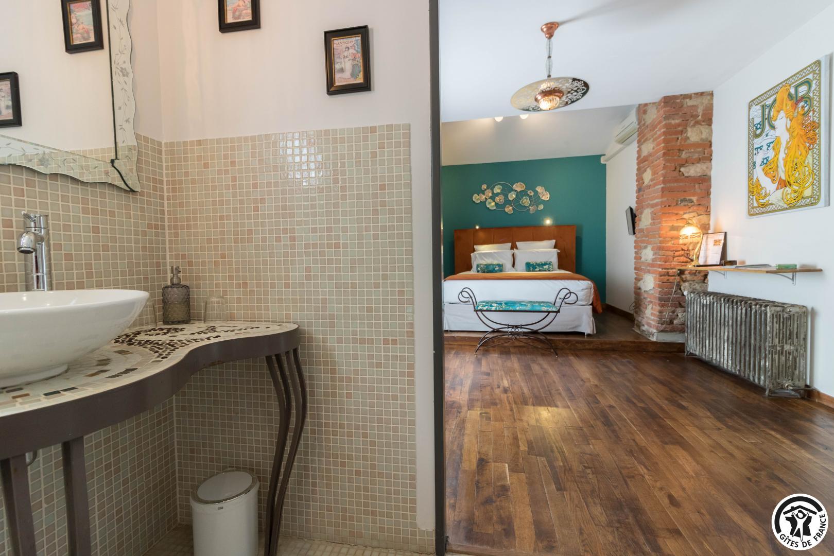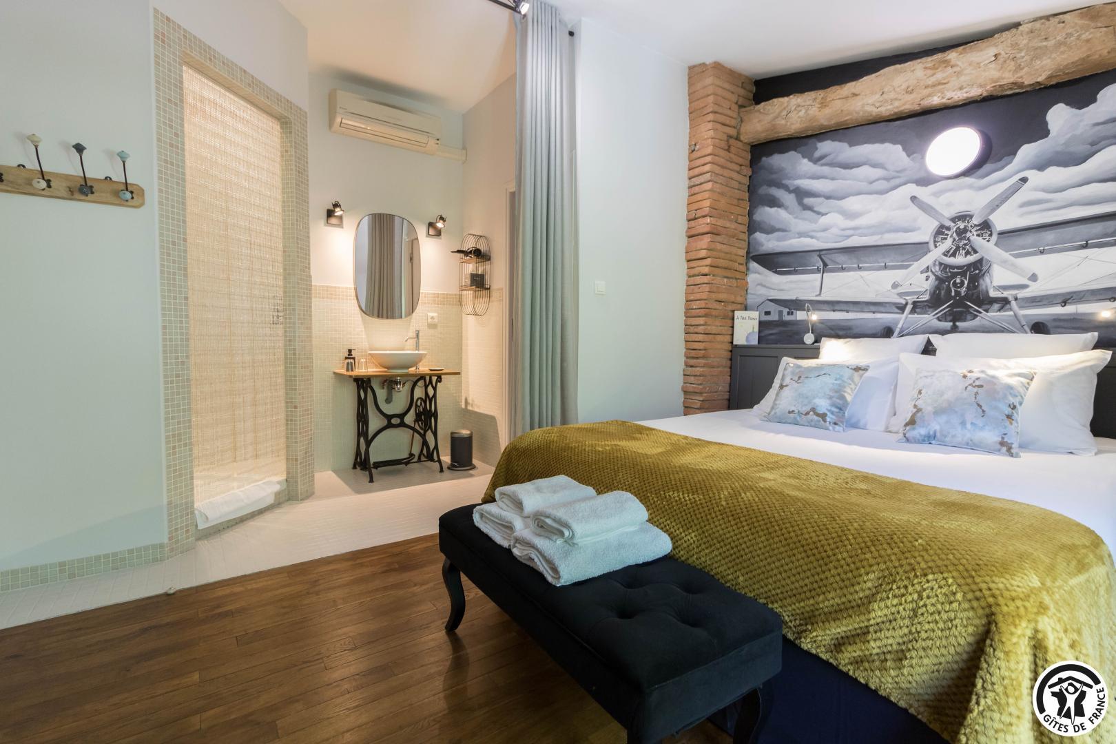 5 voluptuous guest rooms: Nougaro: a vibrant tribute to the great singer from Toulouse. A poetic, hushed atmosphere, where the lyrics resonate through touches of ochre and noble wood. Blue Note: the spirit of a New York jazz club comes alive in this cosy, intimate room. Mucha: the delicate world of Alfons Mucha is expressed in floral arabesques and Art Nouveau furniture. Chocolate: warm, indulgent and enveloping… a true declaration of love for one of mankind’s greatest inventions. Éole: inspired by the genius of Clément Ader, this room pays tribute to the aeronautical adventure.