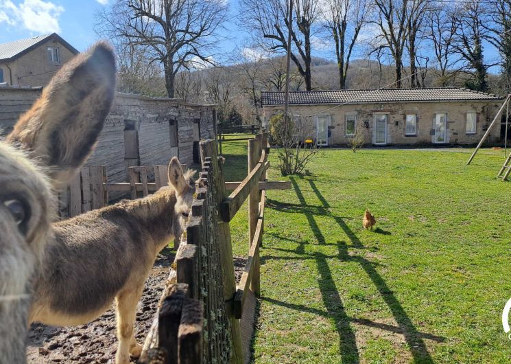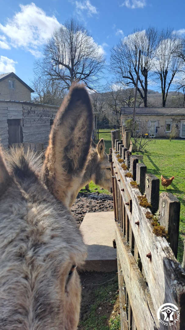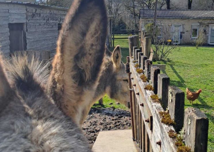 Parking is available right in front of the gîte. Shared courtyard with the owners, plus two hens, one cat and of course Charly, Oli and Lili — the three donkeys who love being petted!