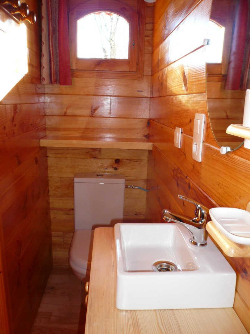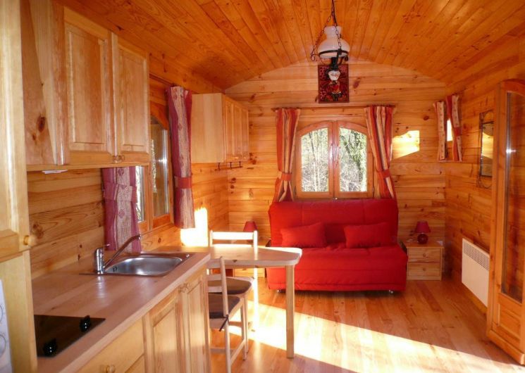 La roulotte se tient au milieu d’une clairière, ne craignez pas d’y être à l’étroit car elle est spacieuse et confortable, l’aménagement optimise chaque espace. En bois massif, elle est aménagée de plain-pied et pensée comme une petite maison fonctionnelle. La pièce de vie regroupe un coin salon chaleureux et une cuisine bien équipée. Une salle d’eau complète l’ensemble, avec WC.