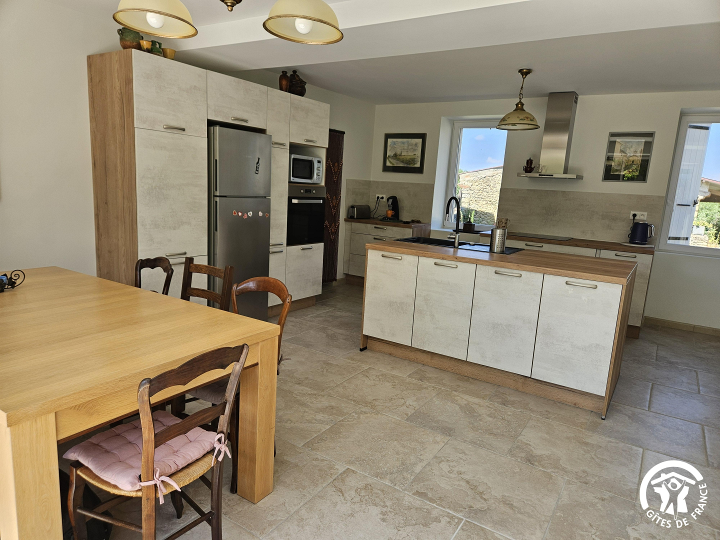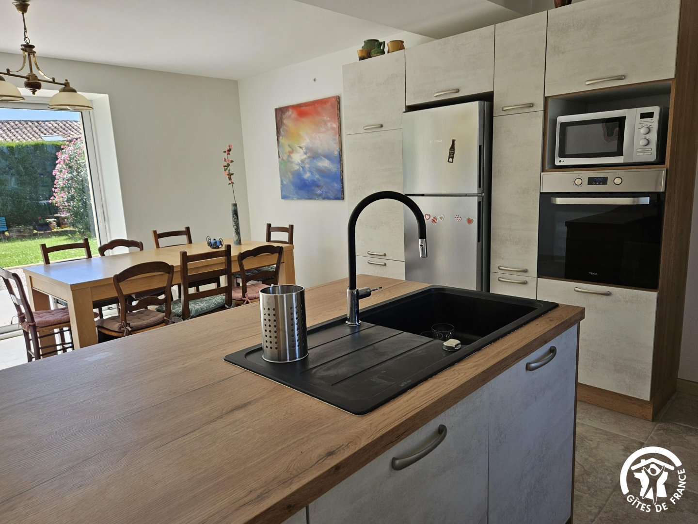 – cuisine/salle à manger moderne (34m²), avec une baie vitrée donnant sur le jardin, un îlot central, toute équipée (four, lave-vaisselle, plaque de cuisson, petit électroménager, réfrigérateur), grande table