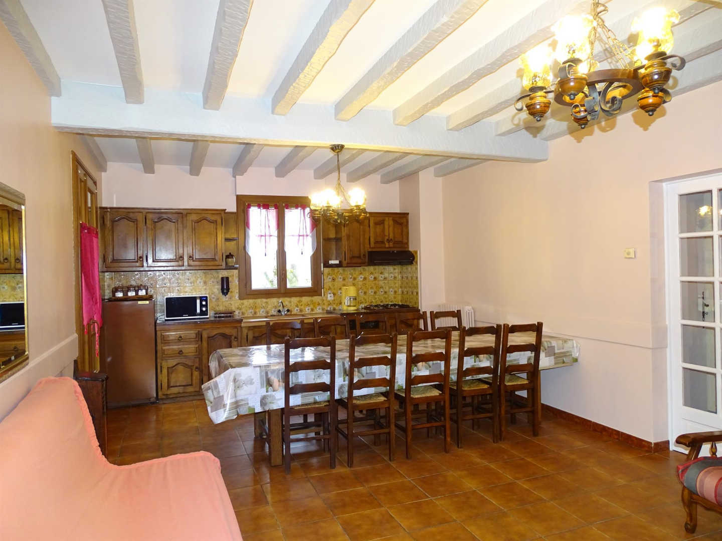 – Pièce à vivre avec cuisine ouverte, grande table à manger et coin salon avec canapé, TV et cheminée (non fonctionnelle).
