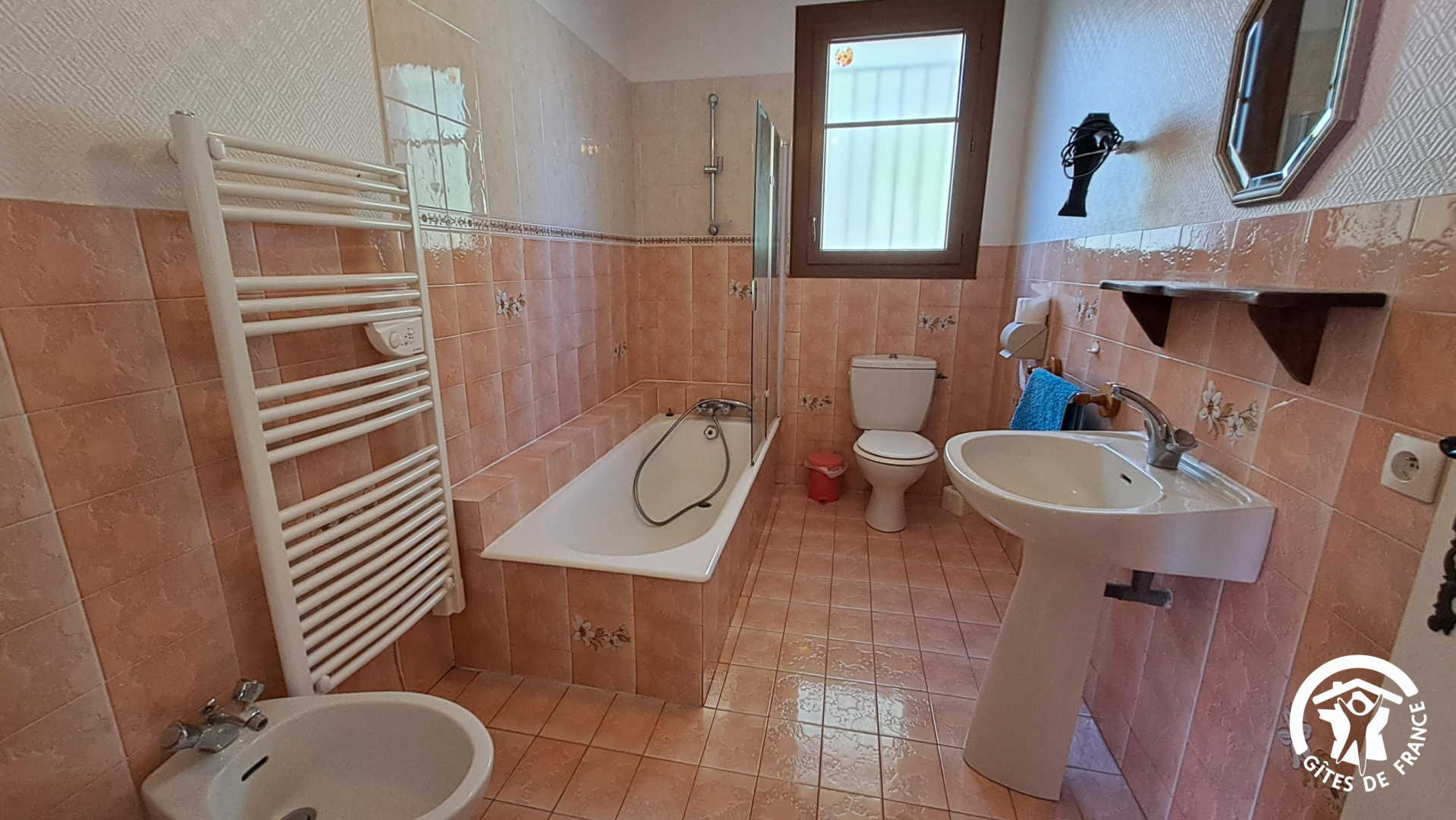 Salle de bain avec baignoire, évier, bidet, toilettes.