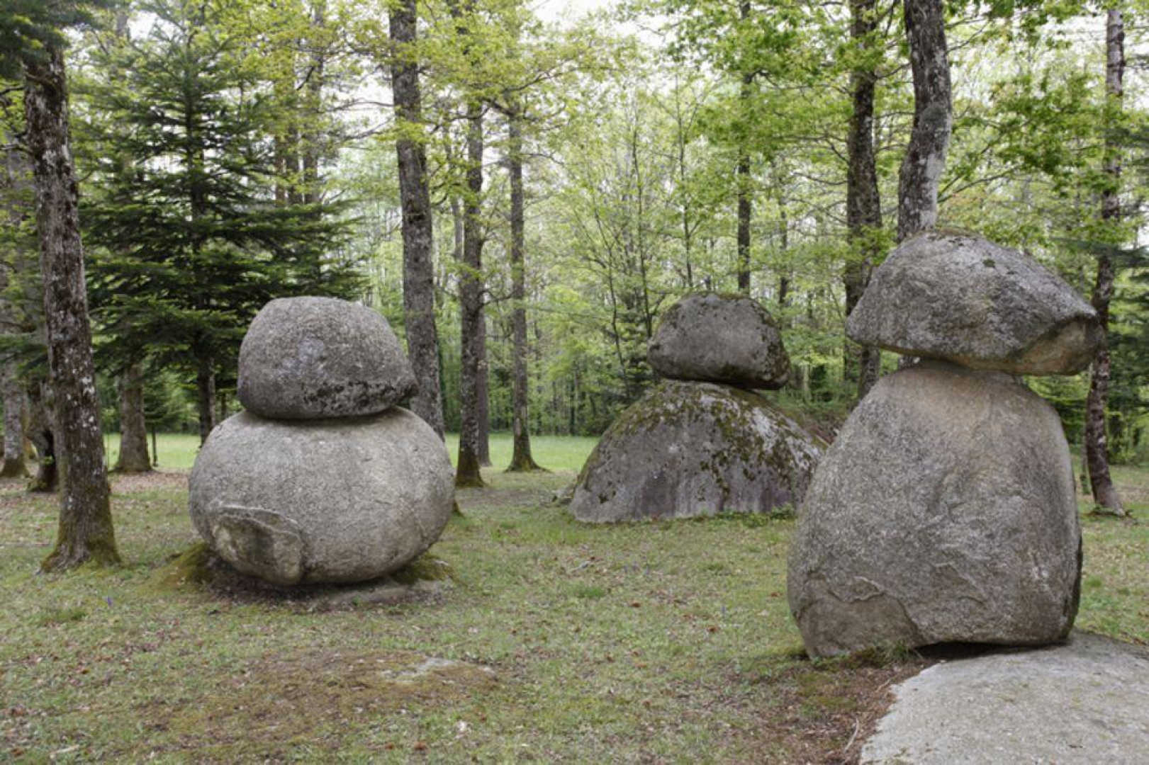 De biens curieux champignons de pierre ont poussé dans la prairie