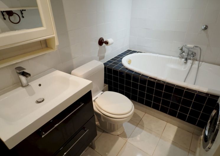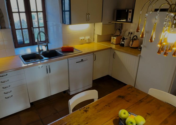 Salon. Cuisine entièrement équipée avec cuisinière à gaz, réfrigérateur, lave-linge, lave-vaisselle, cafetière, grille-pain, four micro-ondes, télévision et lecteur DVD. Table et fer à repasser