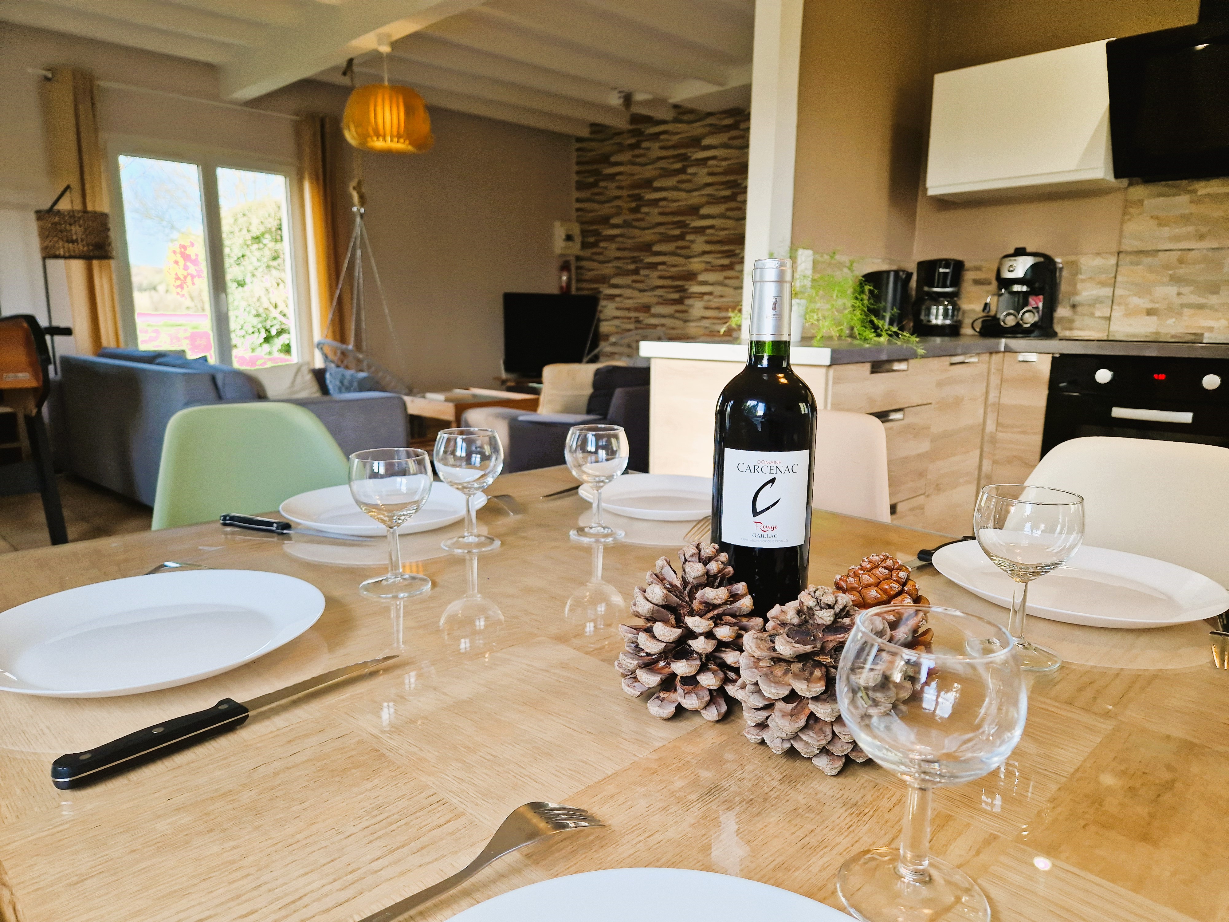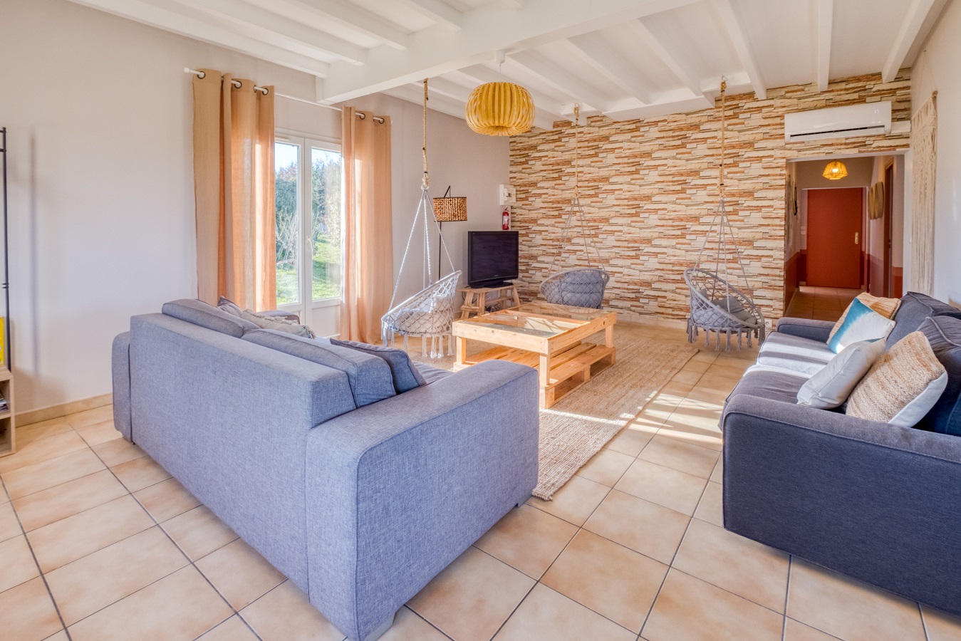 A very large living room with 2 sofas and 3 hanging armchairs to call for well-being and let go in a warm and endearing atmosphere. A beautiful fitted kitchen with an exceptional view of the meadow and the woods. Enough to easily plan for your future holidays with family, friends,