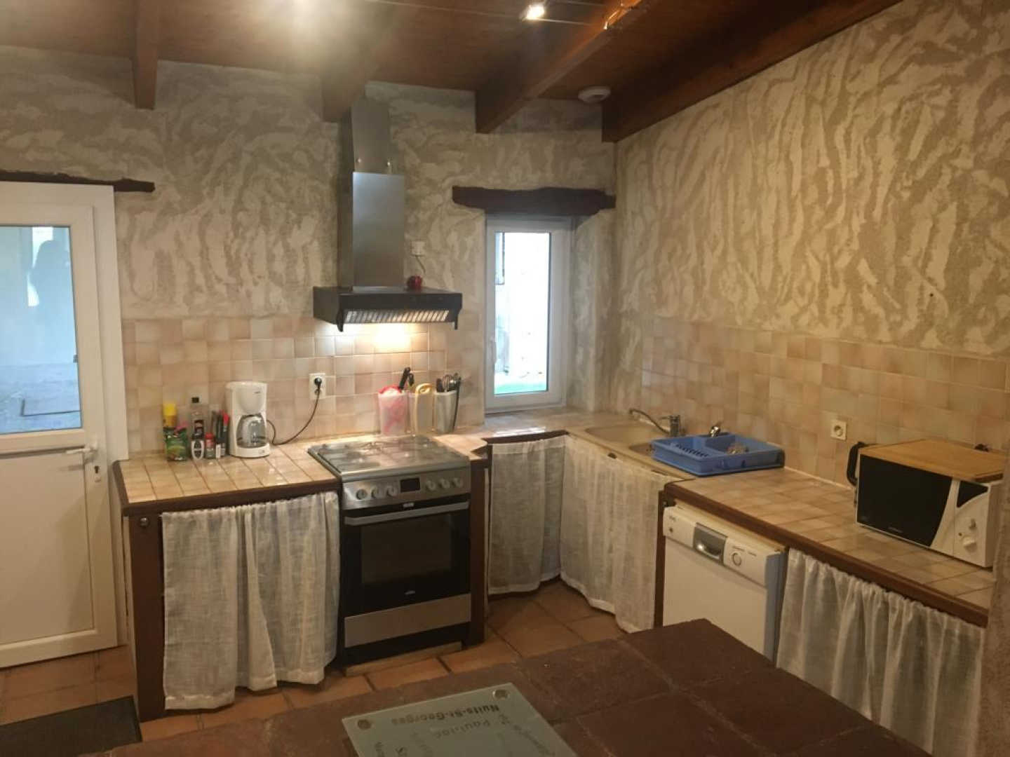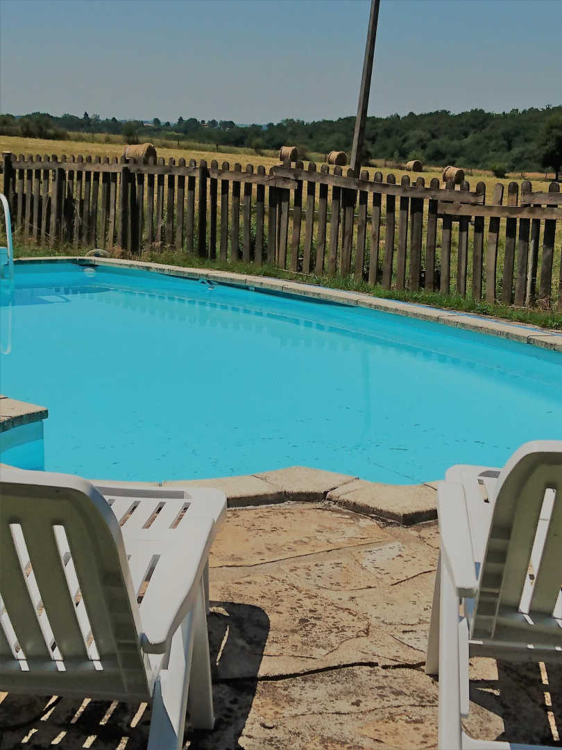 Indep. house near a hamlet. Gr. fl.: living-rm with sofa, kitchen, 1 bdrm (2 beds 3ft3), shower rm with WC. 1st fl.: 3 bdrms(2 bds 4ft6, 1 bd 3ft, 3 bds 3ft9), baby bed, bathrm with WC. Open fire (35€ per cubic meter). Electr. heating. Washing mach., dishwasher. Grounds, covered terrace, car shelter, garden table & chairs. Swimming pool (8×4 m) in common with the owners. Cleaning service. Old renovated house, with local stone front. Quietness and peacefulness guaranteed. In front of the gîte a road with very little traffic. Owners (cattle farmers) at 4 km.
